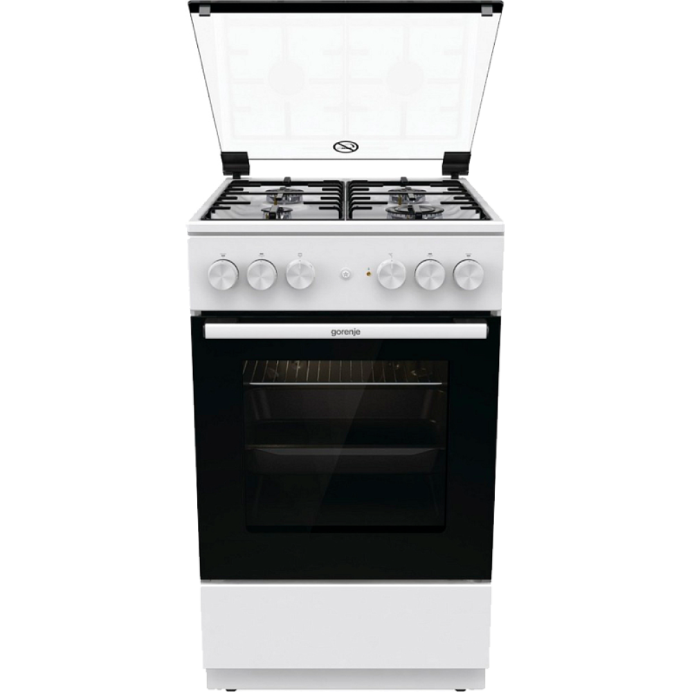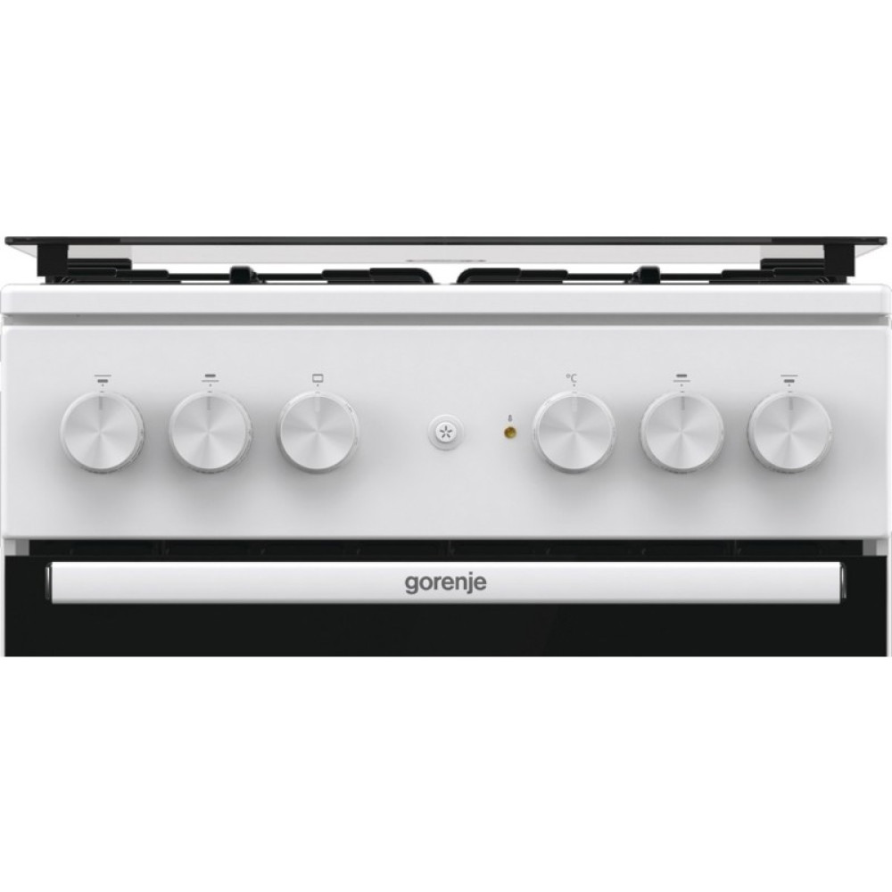Комбинированная плита Gorenje, Линия Essential, Эмаль SilverMatte, объем духовки 68 л, механическое управление, электроподжиг, рельефные направляющие, 2 стекла+термослой, энергоэффективность А, цвет белый