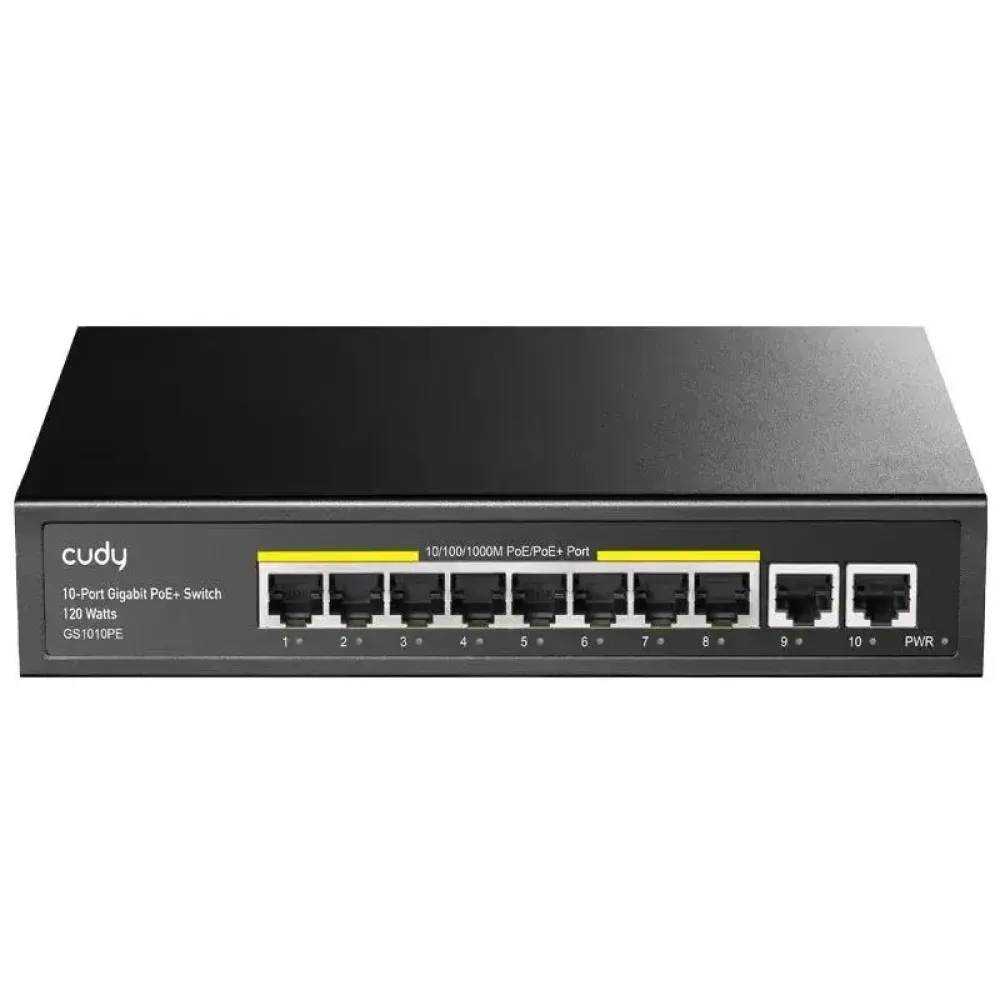Cudy GS1010PE - это 10-портовый гигабитный PoE-коммутатор c поддержкой скорости 10/100/1000 Мбит/сек. Через порты РоЕ передаются и электропитание, и данные к подключенным устройствам. Поддержка стандарта IEEE802.3af/at может обеспечить до 30 Ватт мощности на каждый из портов с 1 по 8, и суммарно до 120 Вт на все PoE-порты.