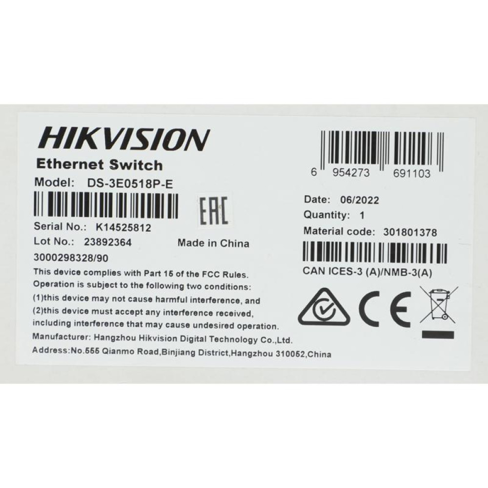 Коммутатор Hikvision DS-3E0518P-E 17x1Гбит/с 1SFP 16PoE+ 230W неуправляемый