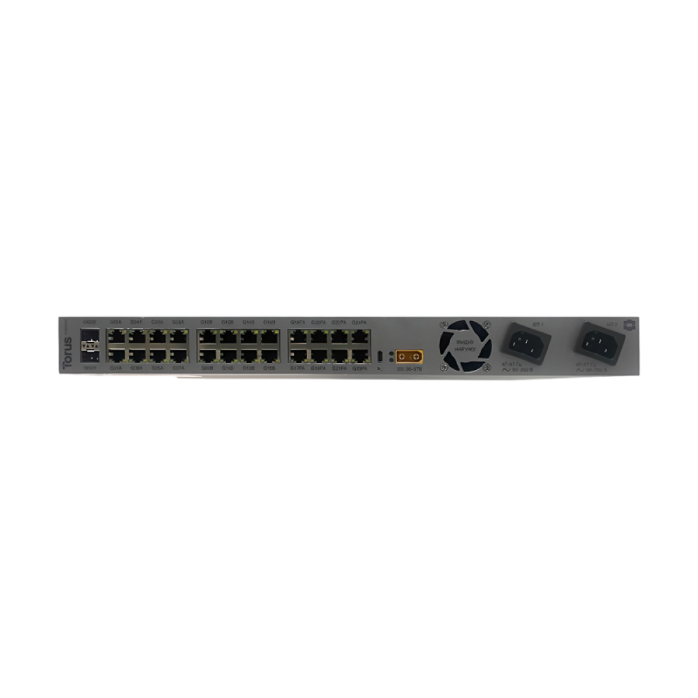 Коммутатор/ L3 управляемый коммутатор TORUS S1-2-24P, 24х10/100/1000 Mbps RJ45, 2x 10 GbE SFP+, PoE 802.3af/at/bt, Passive PoE 24-48v, Консольный порт USB Type C, 16к MAC-адресов, 2 встроенных БП, AC: 90–260 В, 50–60 Гц DC: 36-57 B