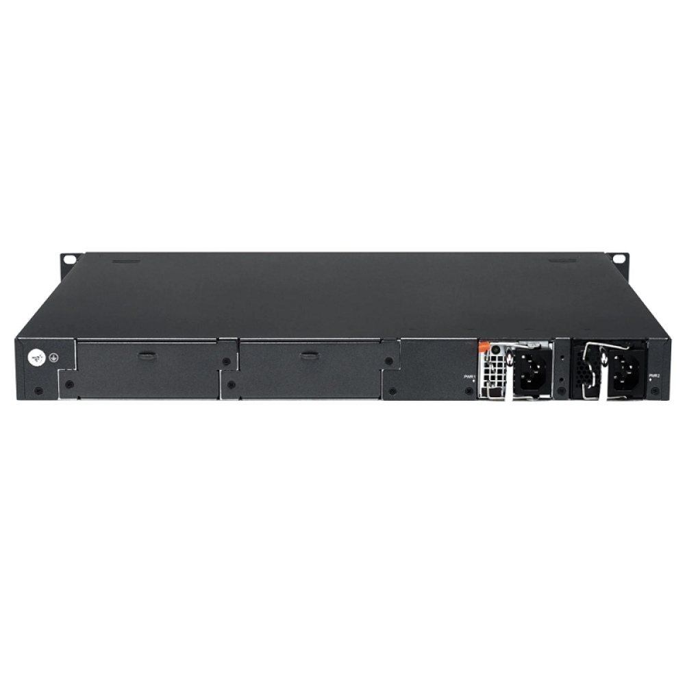 Коммутатор оснащен двумя сменными блоками питания (БП), что обеспечивает высокую надежность и отказоустойчивость. Разъемы питания расположены на задней панели, что упрощает доступ и обслуживание. Это делает Qtech QSW-6300-32T идеальным решением для критически важных приложений, где простои недопустимы.
