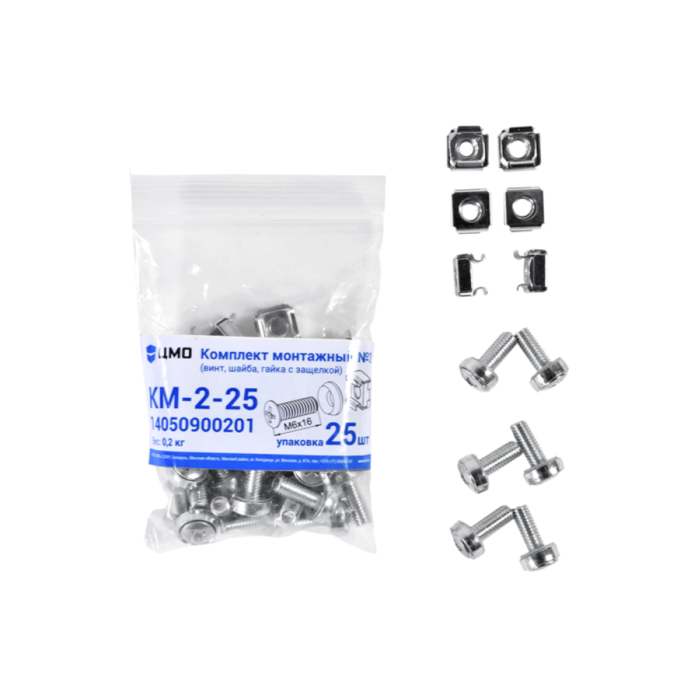 Используются для крепления оборудования в шкафы и стойки. Комплект 25 шт. Комплектация: Винт М6х16(полусфера) – 25 шт.; Гайка с защелкой (клетьевая) М6 - 25 шт.; Шайба (металл) М6 - 25 шт.
