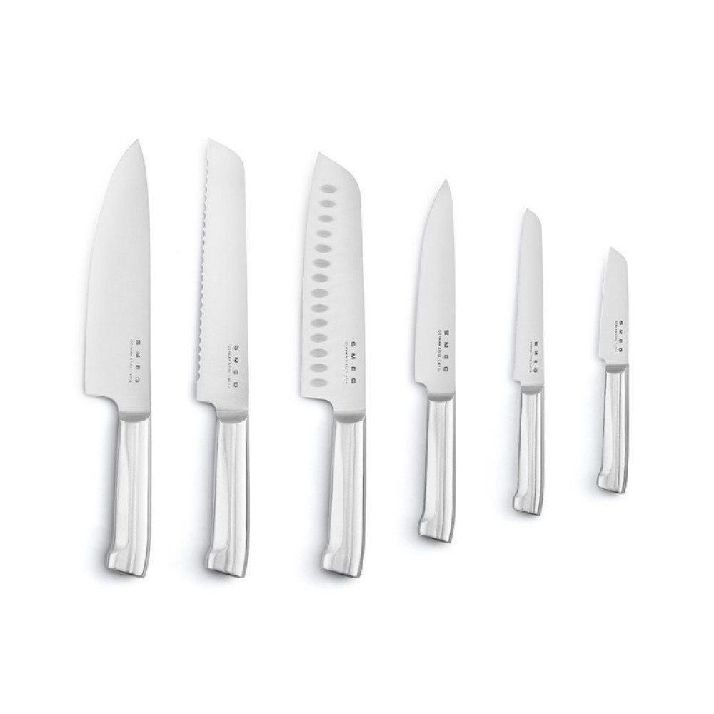 Комплект ножей SMEG, нож для овощей, нож универсальный, нож для мяса, нож сантоку, нож для хлеба, шеф-нож, подставка, цвет черный