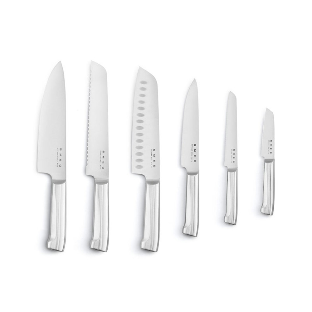 Комплект ножей SMEG, нож для овощей, нож универсальный, нож для мяса, нож сантоку, нож для хлеба, шеф-нож, подставка, цвет кремовый