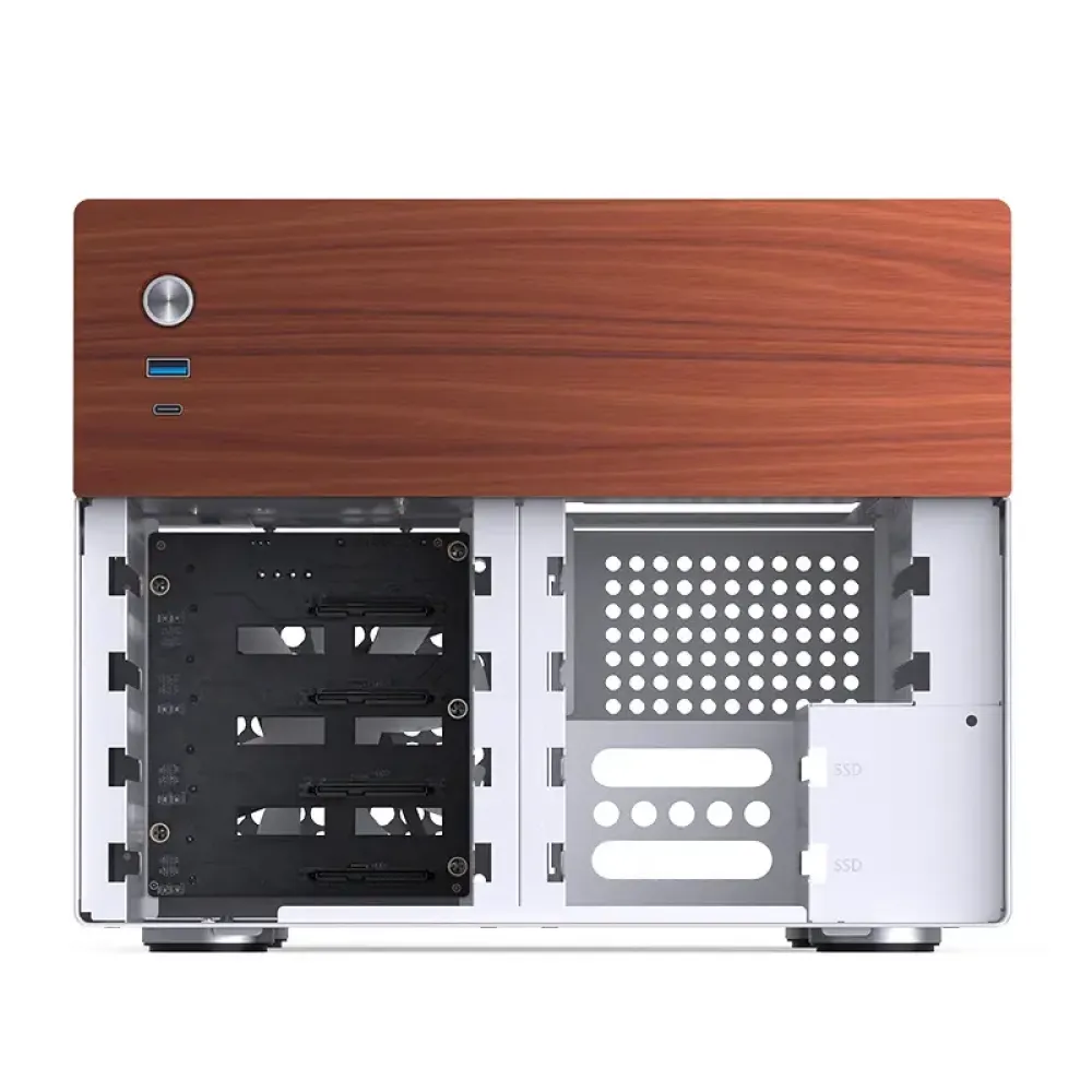 Одной из ключевых особенностей Jonsbo N4 White является его передняя панель, оснащенная интерфейсами USB 3.2 Gen 2 Type-C. Эти порты обеспечивают удобное подключение современных периферийных устройств. Деревянные панели придают корпусу изысканный и премиальный вид, добавляя теплоту и элегантность в общий дизайн.