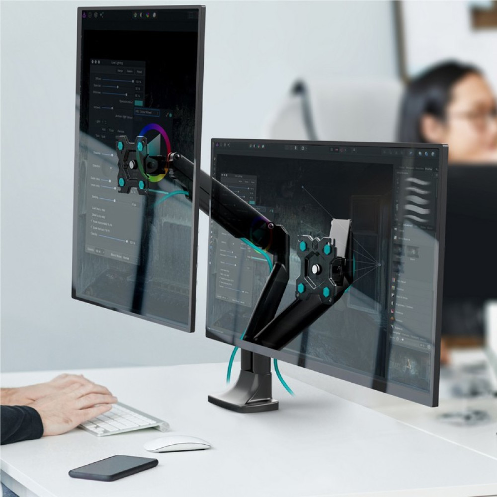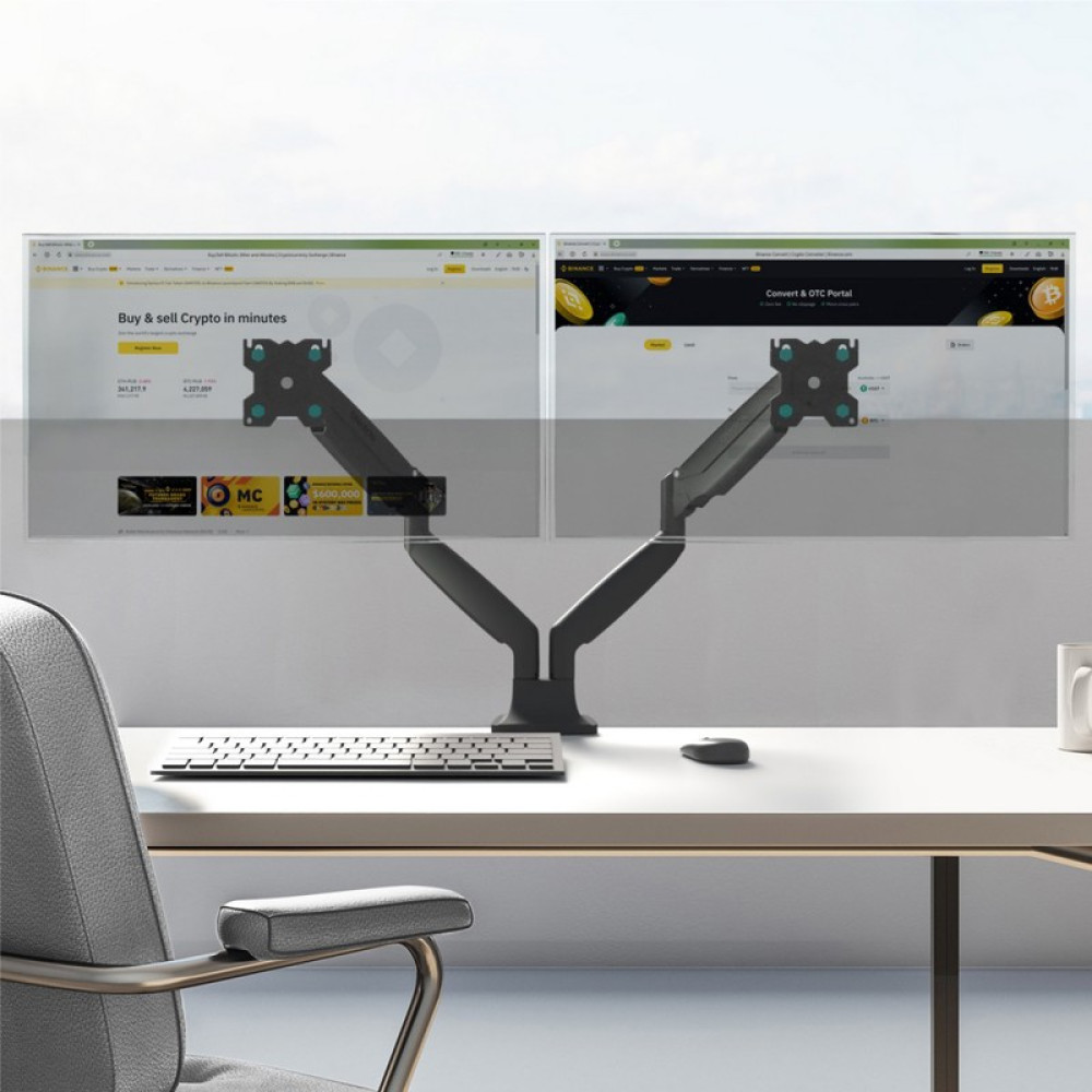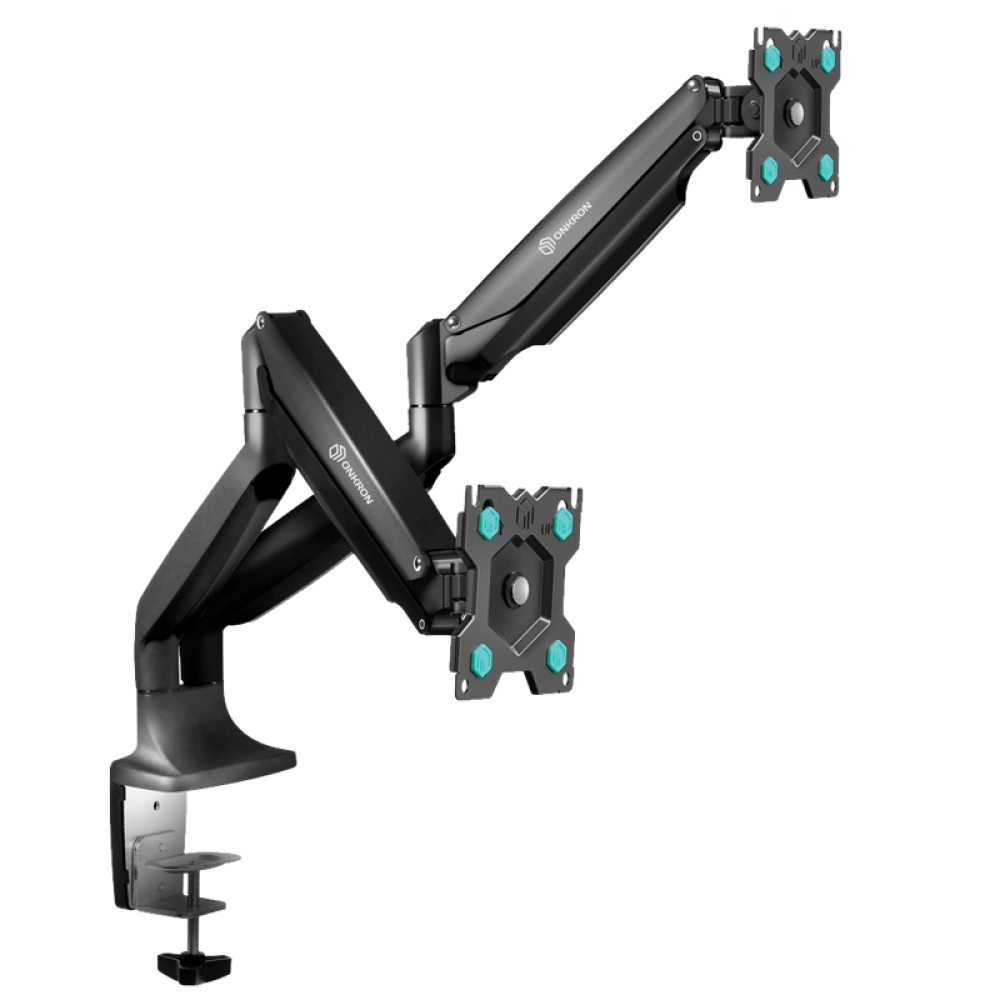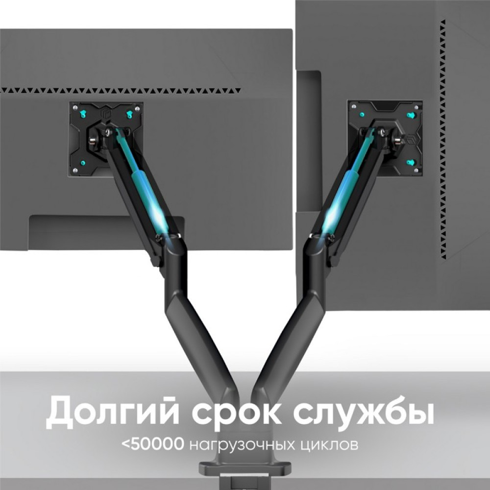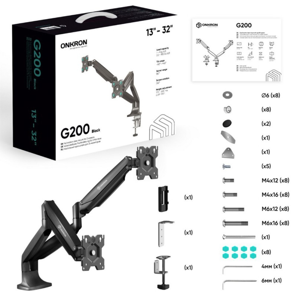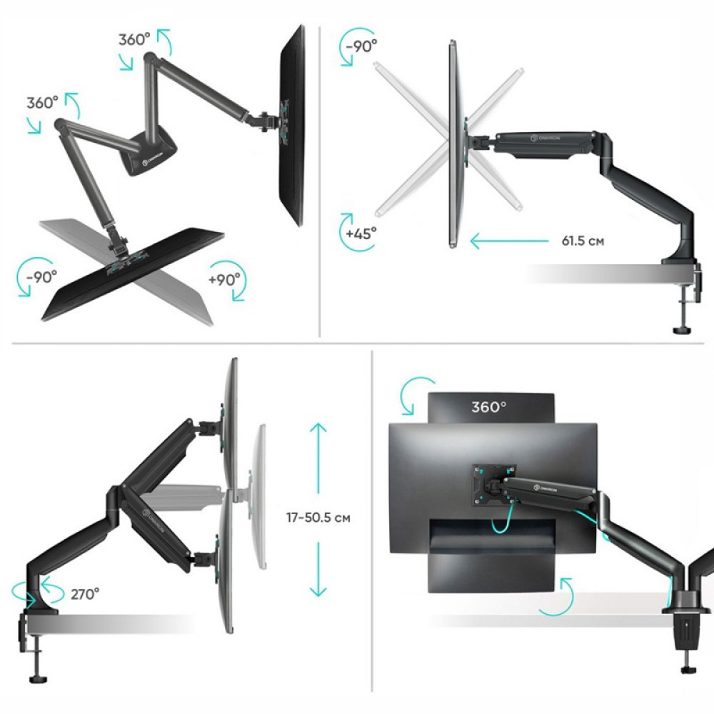 Кронштейн ONKRON 13-32" ГАЗЛИФТ макс 100*100 наклон -90?/+90?, поворот +-90°, 2 колена, вылет от стены до 525мм, крепление к столу 10-85мм, макс общий вес 9кг, черный [ONKRON G200 BLACK]