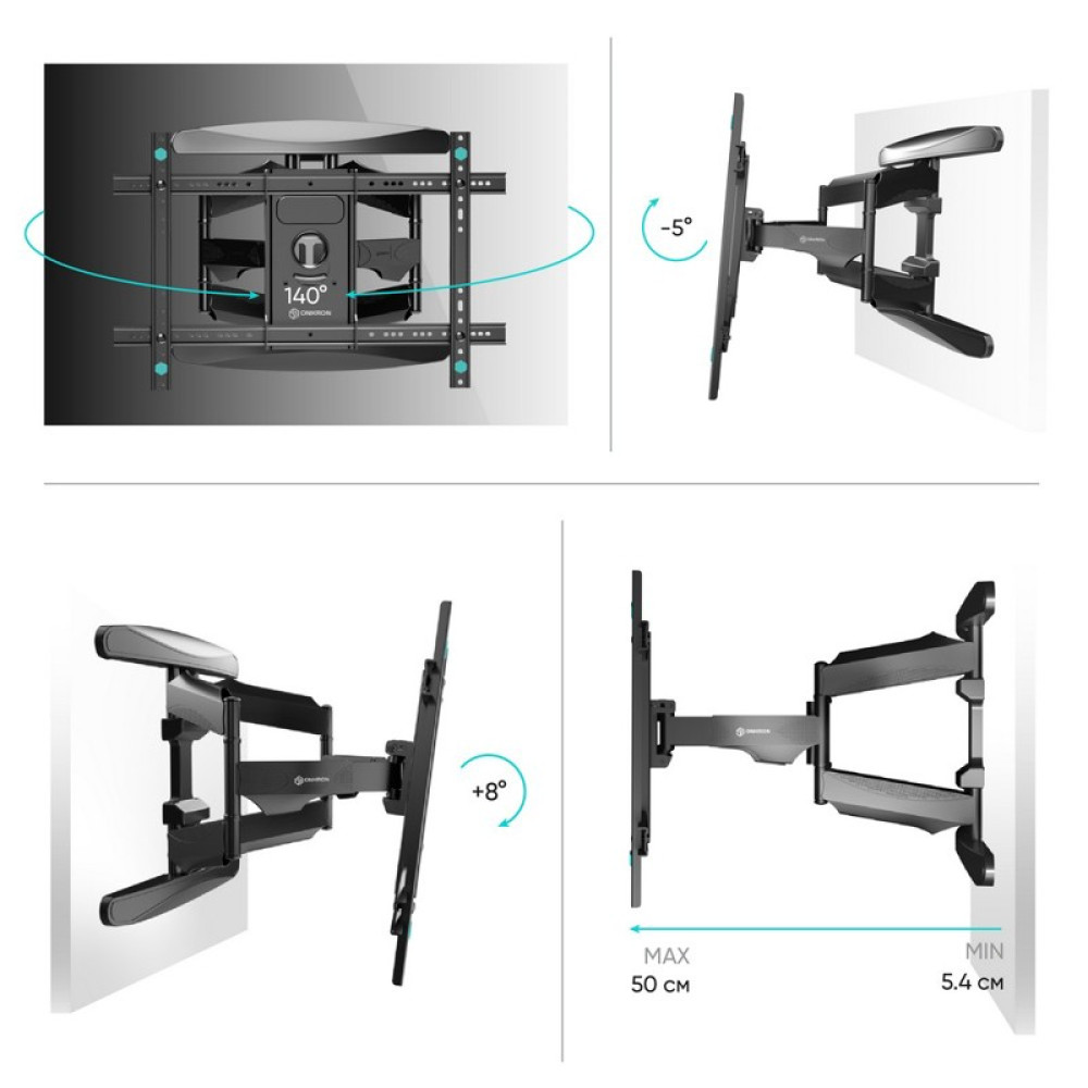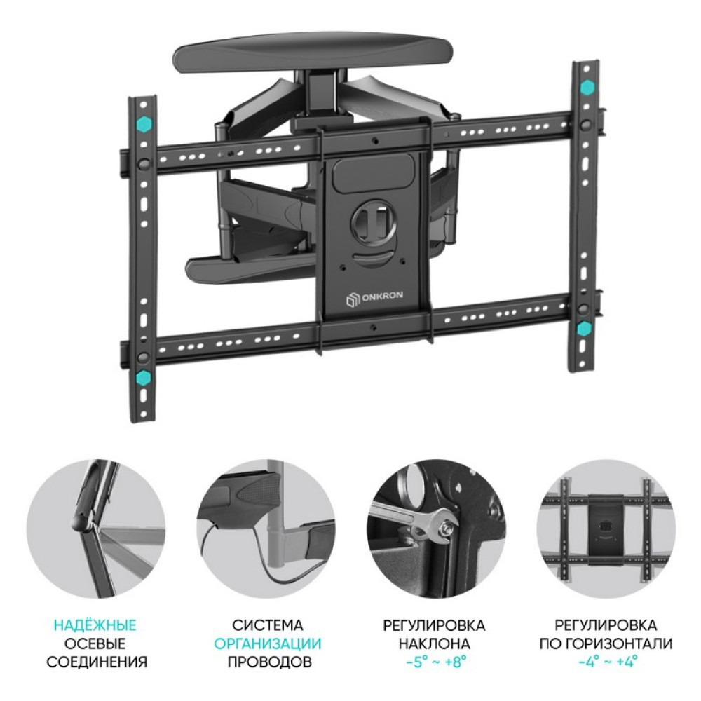 Кронштейн ONKRON/ 40-75" макс 400*600 наклон -5 градусов/+8 градусов, поворот ±140 градусов Макс нагрузка 45,5кг, от стены 54-500мм, черный