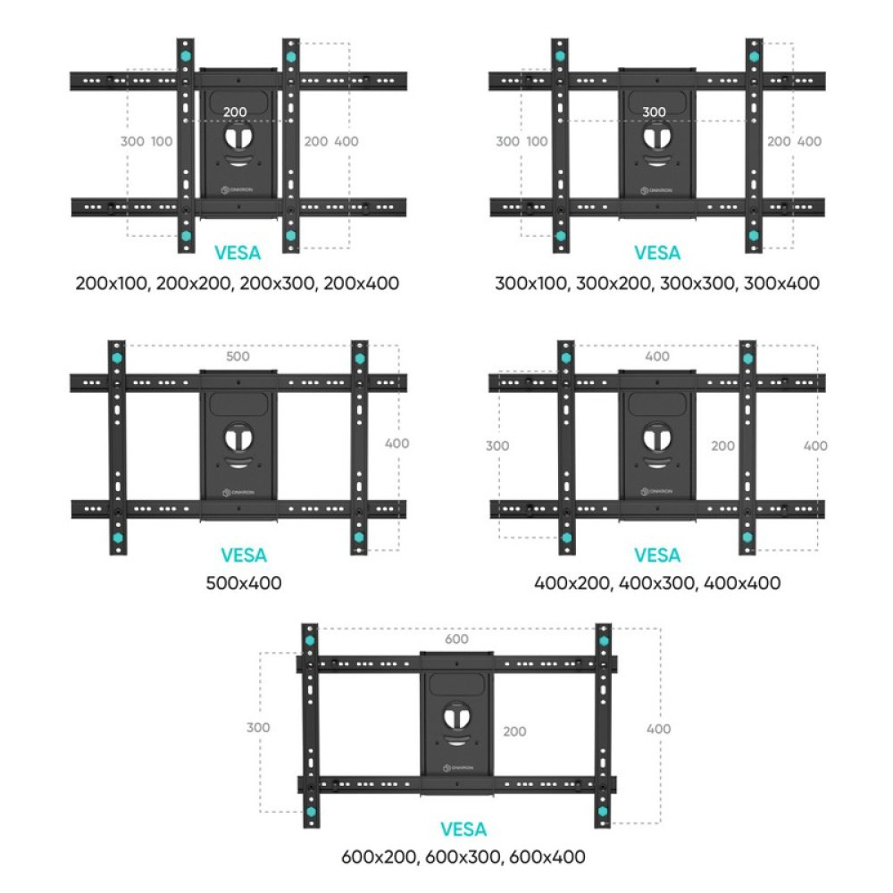 Кронштейн универсален за счет множества предусмотренных производителем размеров VESA – 200x100, 200x200, 200x300, 200x400, 300x100, 300x200, 300x300, 300x400, 400x200, 400x300, 400x400, 500x400, 600x200, 600x300, 600x400 мм.