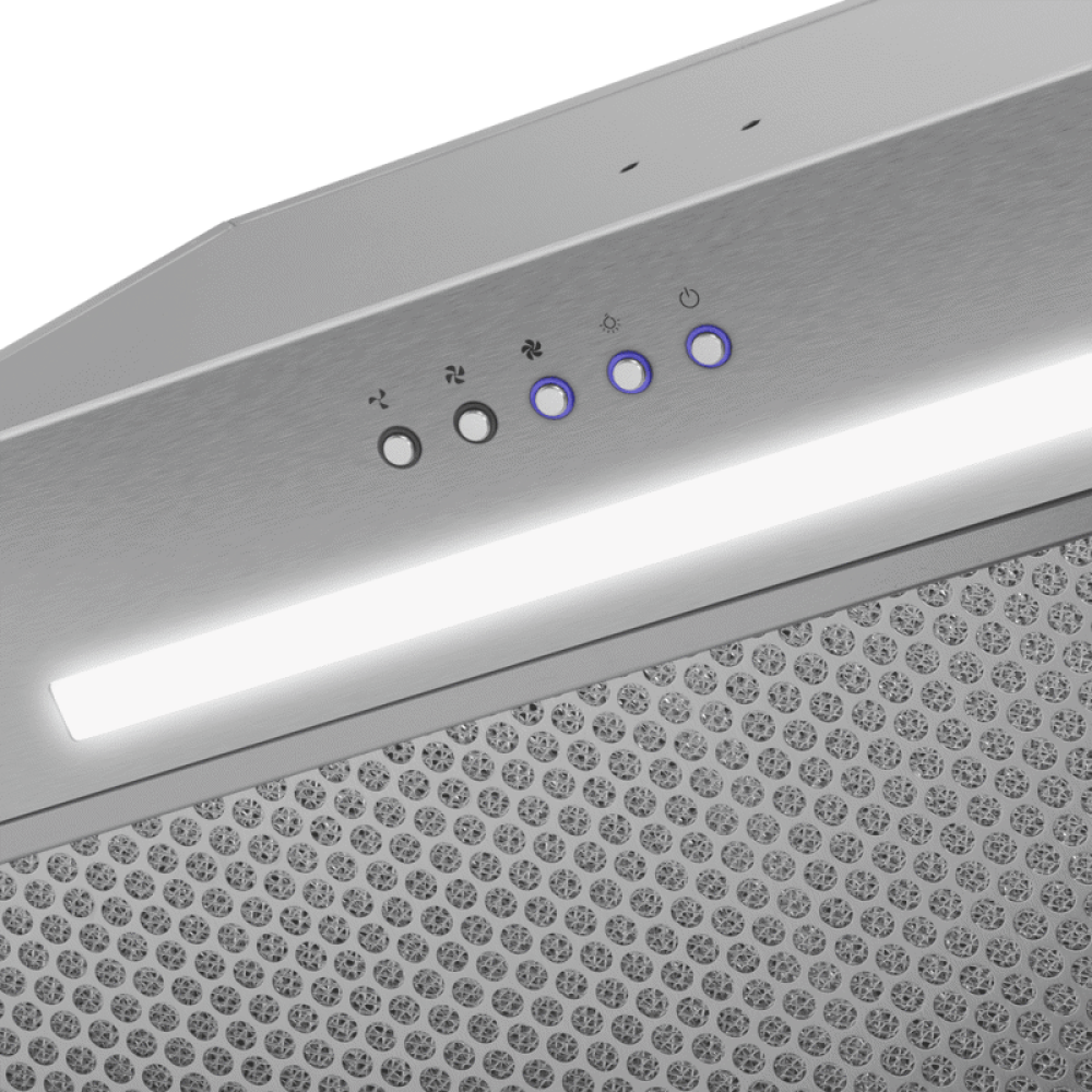 Классическая встраиваемая кухонная вытяжка монтируется в навесной шкаф над поверхностью плиты. Может использоваться для отвода воздуха из помещения при подключении к системе домовой вентиляции или очищать воздух с помощью сменного угольного фильтра.Фронтальная панель выполнена из нержавеющей стали с высококачественным покрытием. Многослойный жироулавливающий алюминиевый фильтр, расположенный по центру панели, легко вынимается из вытяжки и полностью разбирается, что сильно упрощает его чистку. Электронное управление позволяет включить освещение и выбрать одну их 3-х скоростей работы - две стандартные и одна турбо (для быстрой очистки воздуха в экстренных случаях, например, если что-то пригорело). Освещение рабочей поверхности обеспечивается LED-лампой 3,5 Вт .Мотор мощностью 220 Вт с максимальной производительностью 1150 м3/ч. Использование лучших комплектующих и высокое качество сборки обеспечивает низкий уровень шума работы вытяжки – не более 45 дБ. Для режима рециркуляции необходимо установить два угольных фильтра CF 110