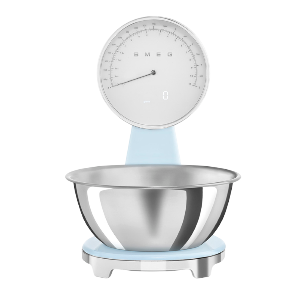 Кухонные весы SMEG, аналоговый/цифровой дисплей, выбор единицы измерения, максимальный вес 5 кг, шаг 1 г, цвет пастельно-голубой