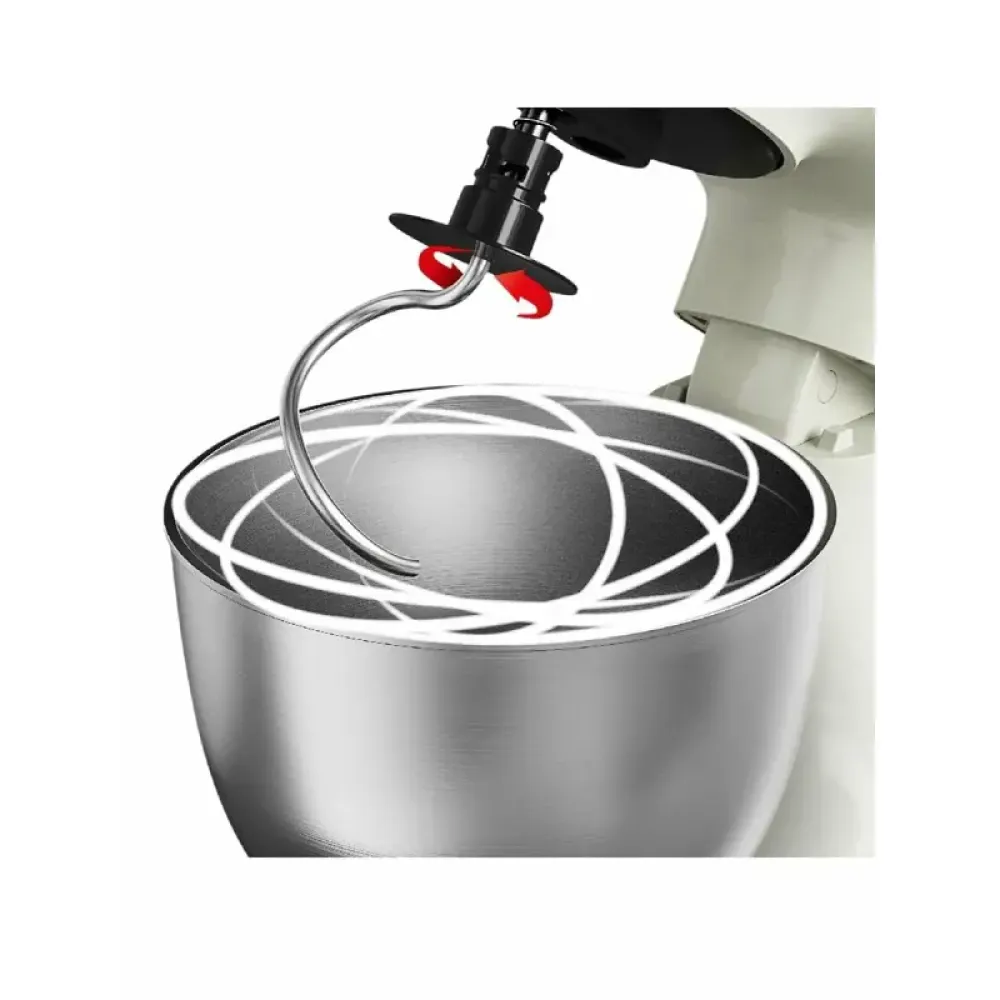 Оснащён классическим набором: венчик, насадка‑миксер и крюк для теста — всё, что нужно для приготовления кремов, теста, брёш и других домашних рецептов. Объём чаши 3,5 л, что позволяет работать с тестом до 800 г или взбивать до четырёх яичных белков.