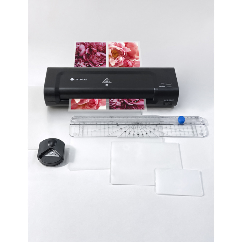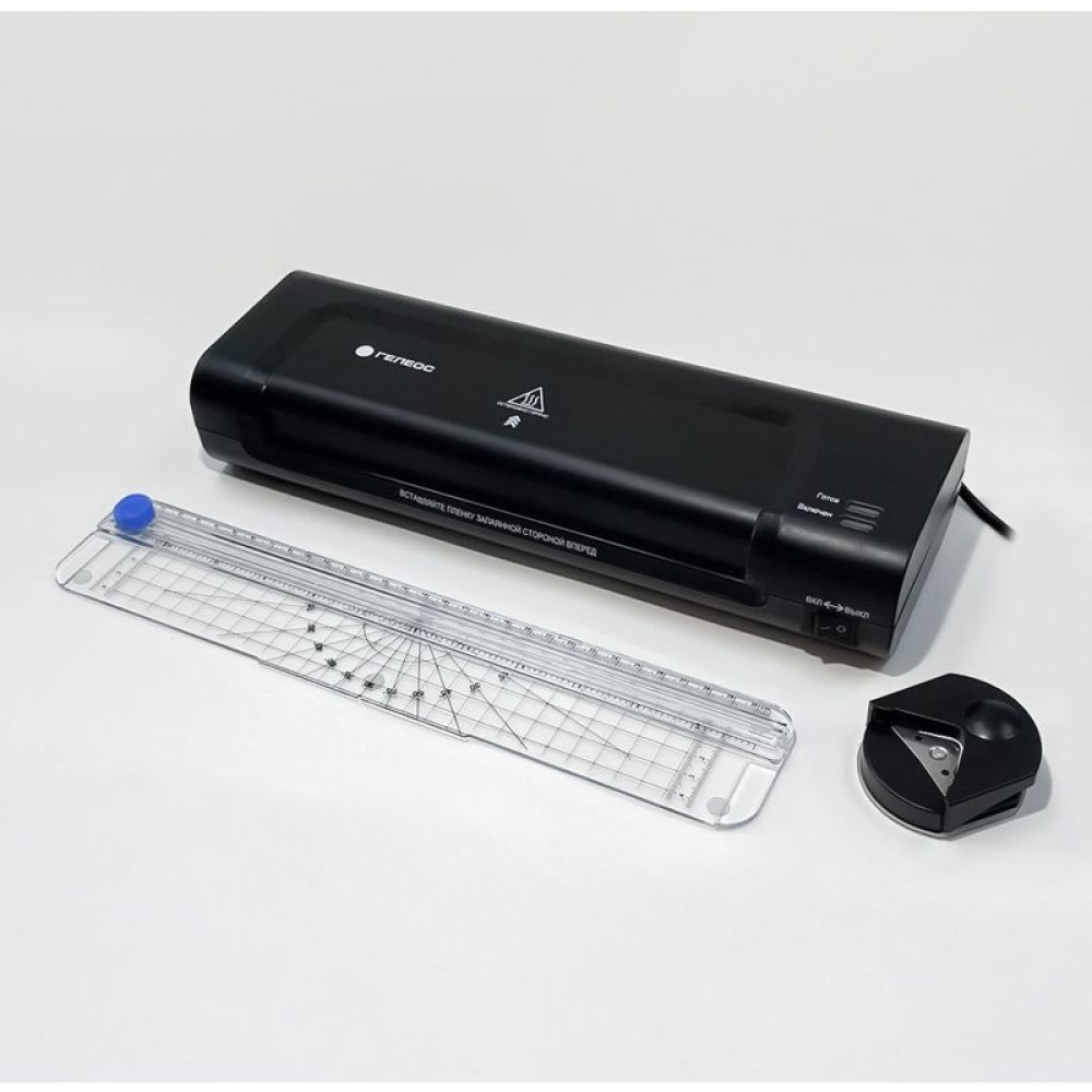 Ламинатор ГЕЛЕОС ЛМ A4 Комбо, А4, 2х150 (пленка 75-150мкм), 300 мм/мин, 2 вала, пласт. корпус, мах толщина 0,6мм, разжим валов, + резак, обрезчик углов и стартовый набор пленок