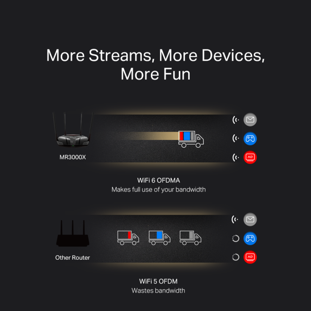 Маршрутизатор Mercusys MR3000X AX3000 обеспечивает высокую скорость передачи данных благодаря поддержке стандарта Wi-Fi 6. Это позволяет быстро передавать большие объемы информации, что особенно важно для работы с мультимедийными данными и в условиях высокой нагрузки на сеть.