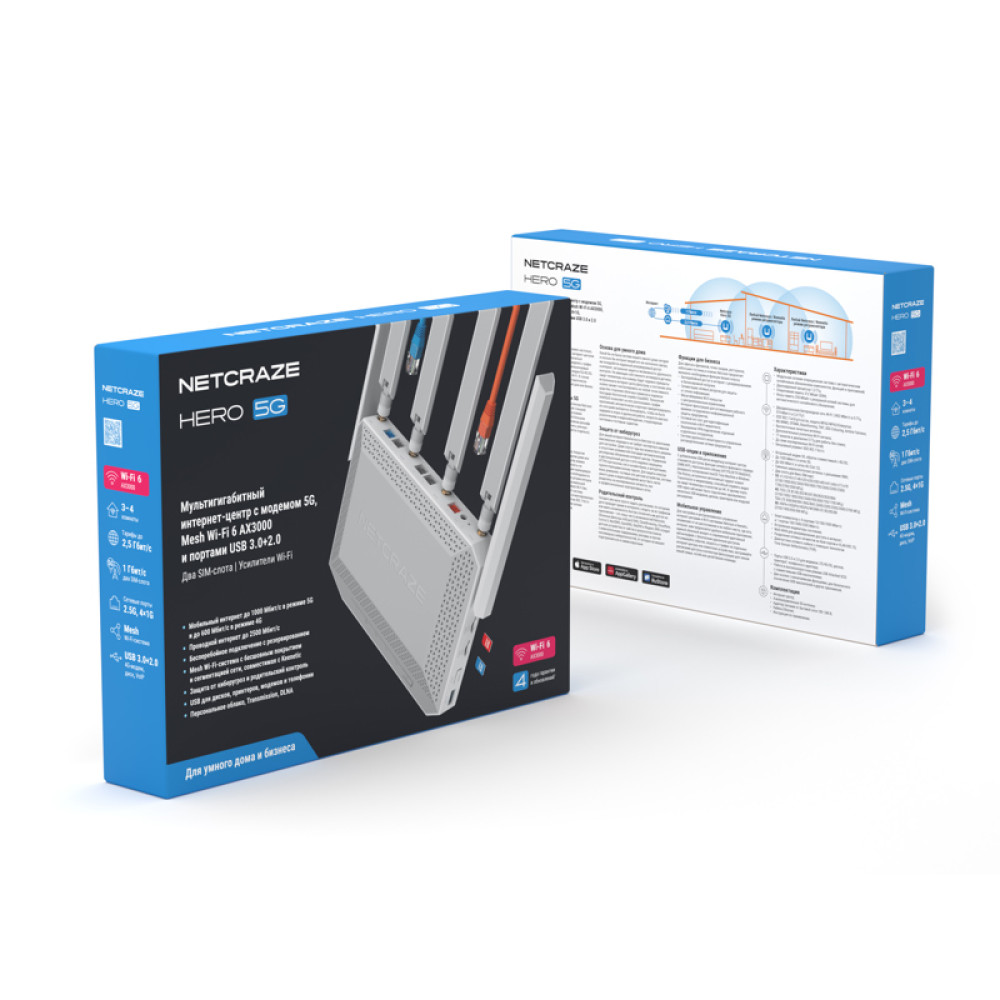 Маршрутизатор/ Netcraze Hero 5G Мультигигабитный интернет-центр с модемом 5G, двумя слотами для SIM-карт, Mesh Wi-Fi 6 AX3000, Smart-коммутатором 1?2.5G и 4?1G, многофункциональными портами USB 3.0 и 2.0