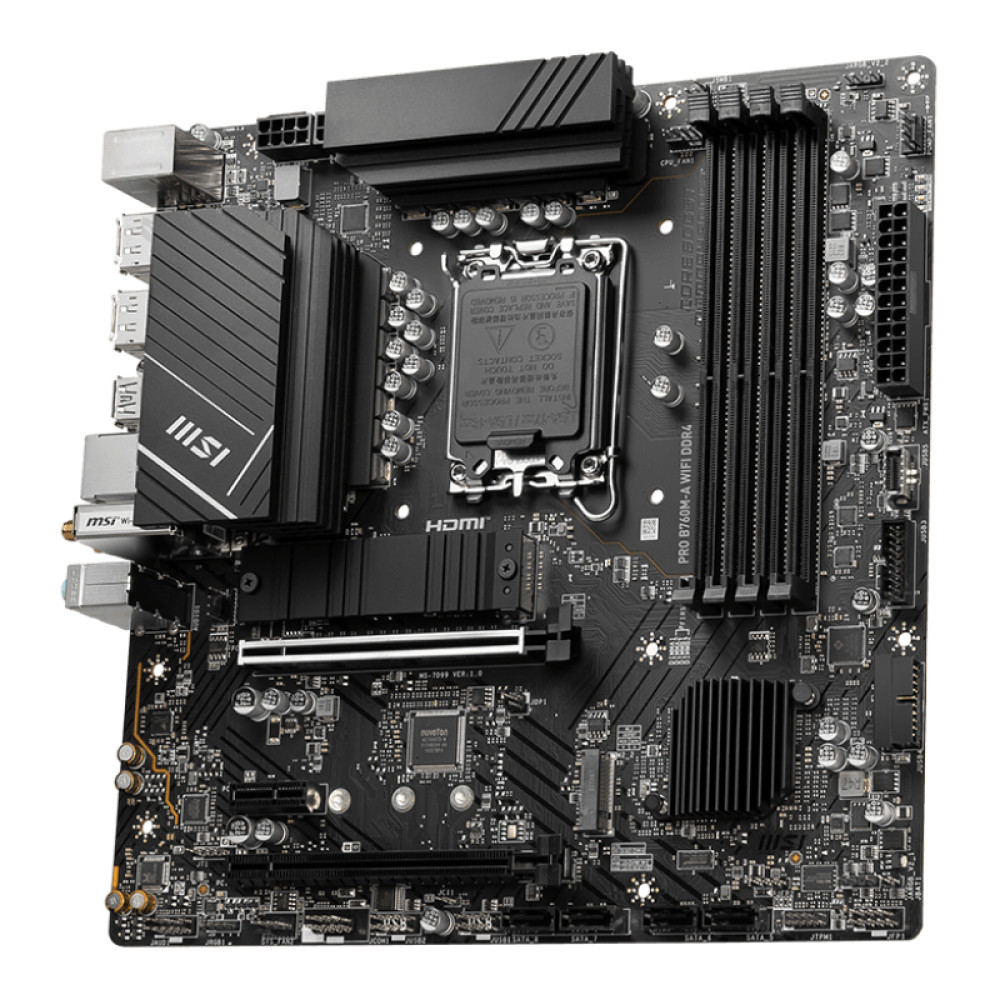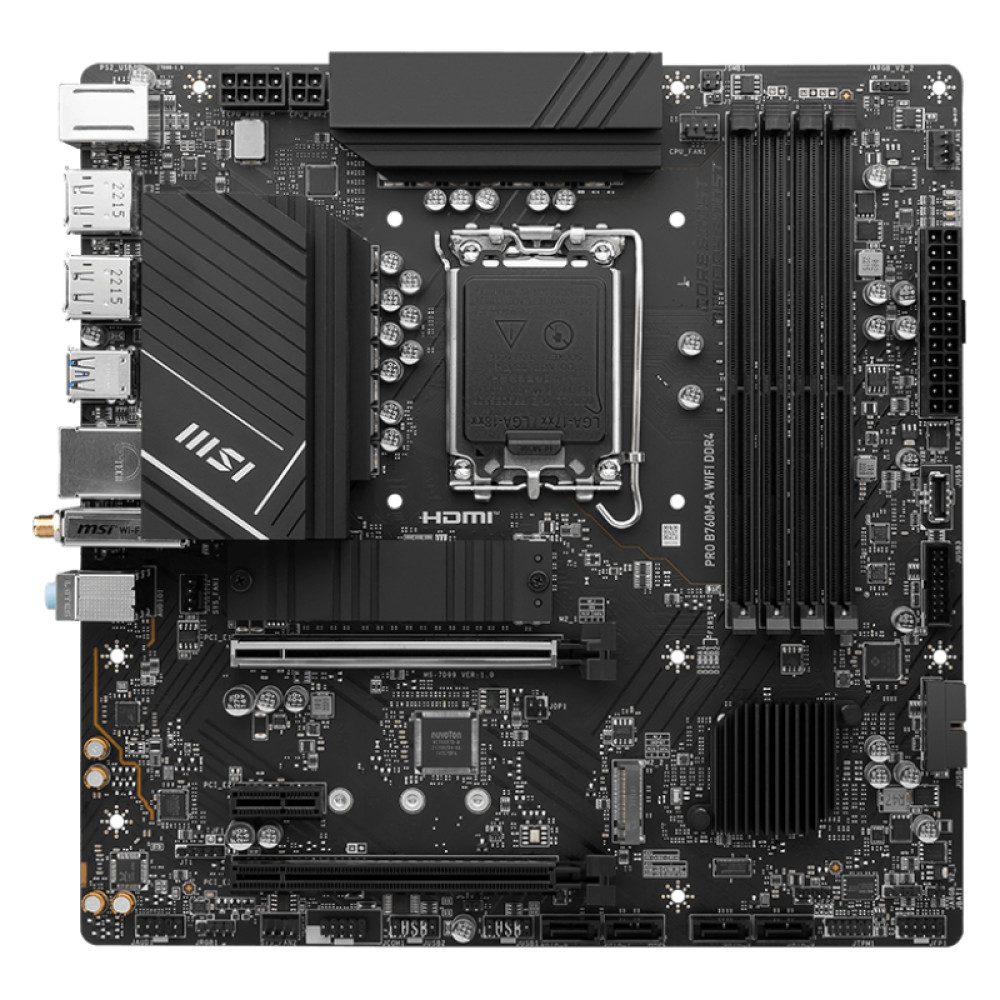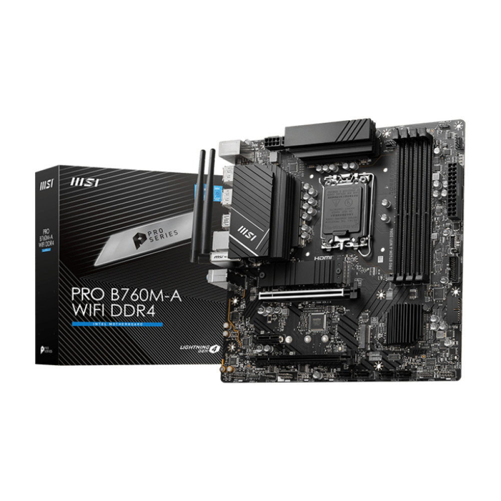 Материнская плата MB MSI INTEL B760 s1700, 4xDDR4(128GB), 2xHDMI 2.1/2xDP, 1xPCIe 4.0x16, 1xPCIe 3.0x16, 1xPCIe 3.0, 1xLAN (2.5GbE), Wi-Fi, BT, 4xSATA 6Gb/s, 2xM.2, 4xUSB 3.2, 2xUSB 2.0, 1xPS/2, mATX
