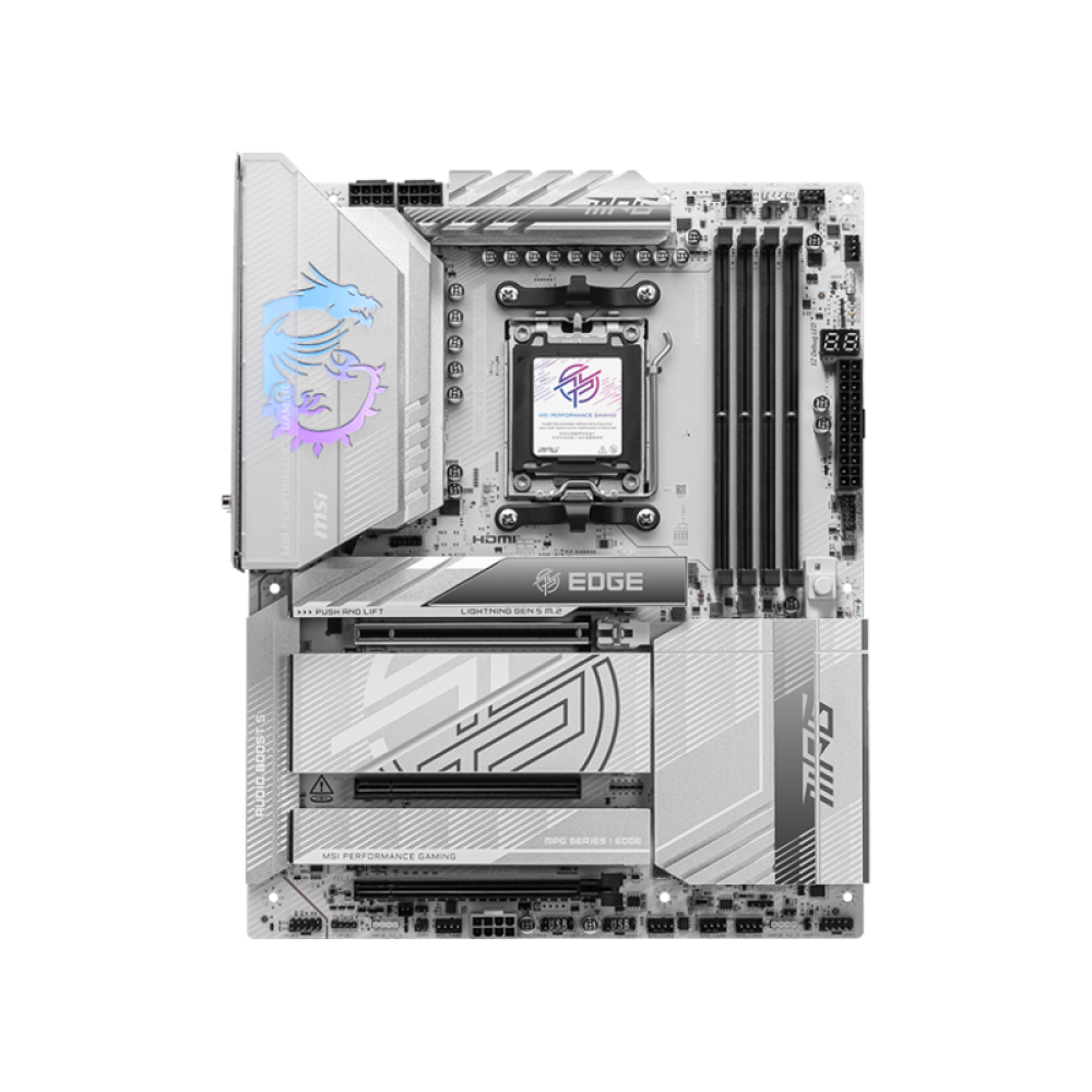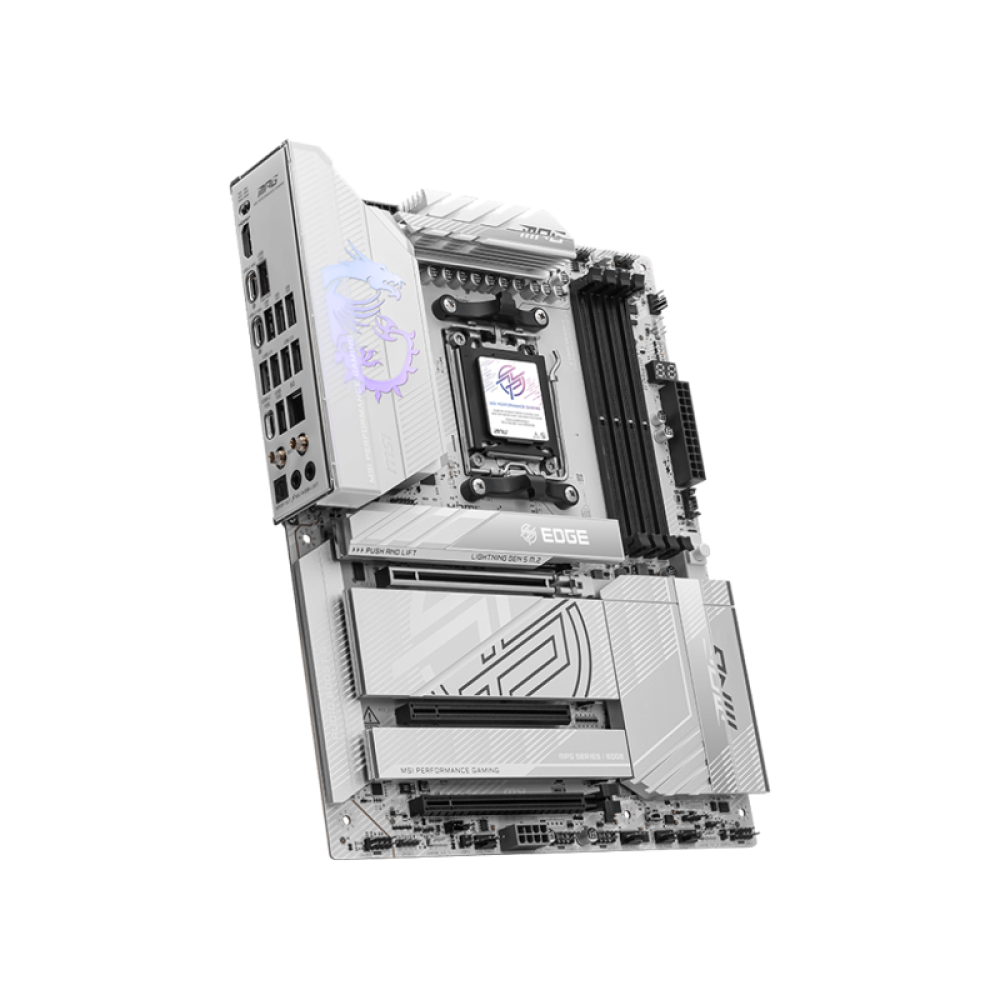 Материнская плата MSI MPG X870E EDGE TI WIFI представляет собой решение для геймеров и энтузиастов, которые стремятся создать мощный и современный компьютер на базе процессоров AMD Ryzen 7000, 8000 либо 9000 серии. Эта модель выделяется своим стильным серебристо-белым дизайном, высокими технологиями и широкими возможностями для доработки системы, что делает ее идеальным выбором для сборки производительной игровой или рабочей станции.