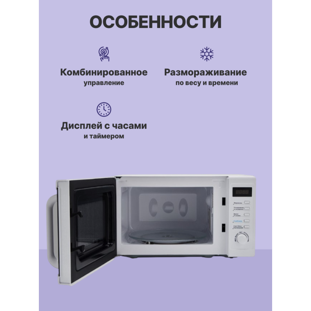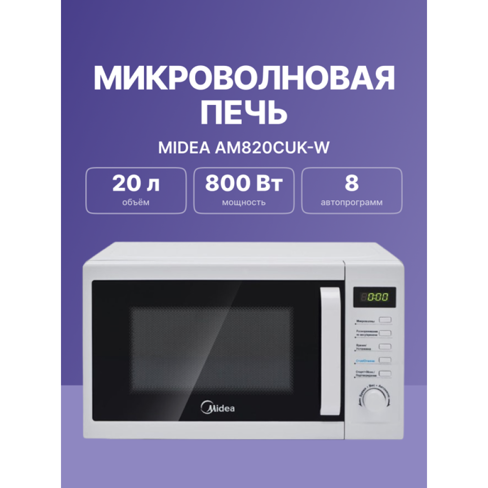 Микроволновая печь Midea AM820CUK-W - классическая микроволновая печь в белом цвете - безупречно впишется в любой интерьер. Объем 20 литров, мощность 800 Вт, за счет которой происходит быстрый и равномерный разогрев или разморозка продуктов . В модели присутствуют 8 автоматическиих программ приготовления: овощи; рыба; мясо; макароны; паста; картофель; пицца; суп. Авторежимы позволяют быстро выбрать нужную программу под ваше блюдо, ежедневная готовка становится макимально простой и удобной Быстрый старт одним нажатием кнопки упростит настройки приготовления. Стильный LED дисплей с часами и нейтральной подсветкой. Звуковой сигнал по окончании программы. Внутреннее покрытие камеры эмаль, дверца открывается при помощи ручки.