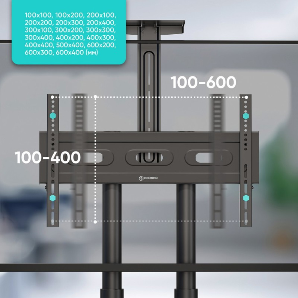 Мобильная стойка ONKRON на 1 ТВ/ 40-70" от 200х200 до 400х600 наклон 0 градусов, поворот 0 градусов макс нагр 55,5кг Высота 1200-1500мм, кабель-канал, регулировка полки по высоте, колесики с блокировкой, черная