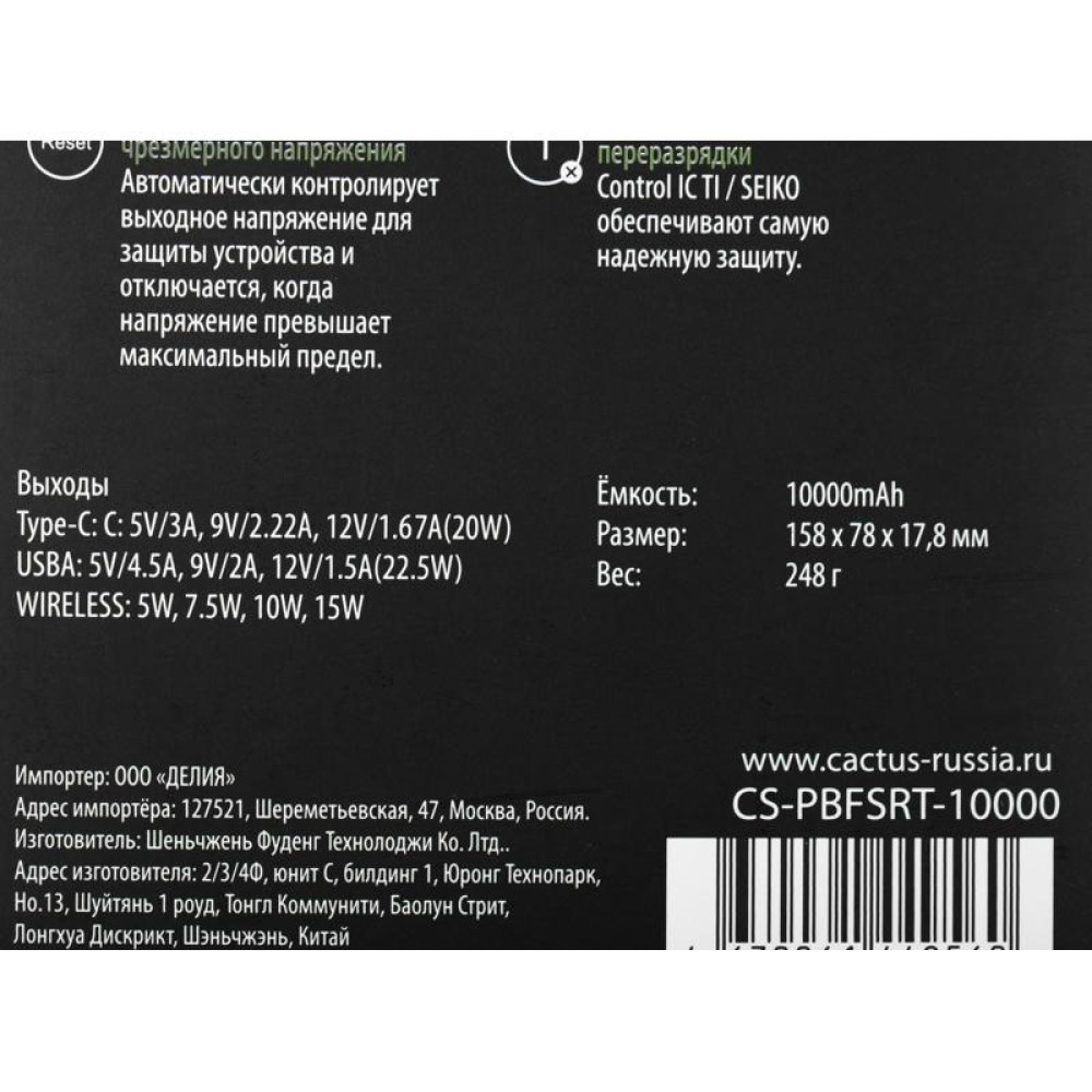 Мобильный аккумулятор Cactus CS-PBFSRT-10000 10000mAh 4.5A USB-A/USB-C беспров.зар. черный
