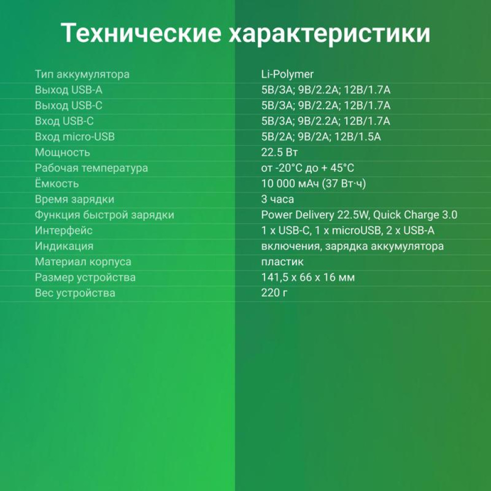 Мобильный аккумулятор Digma DGPF10C 10000mAh QC3.0/PD3.0 22.5W 3A 2xUSB-A/USB-C черный (DGPF10C22PBK)