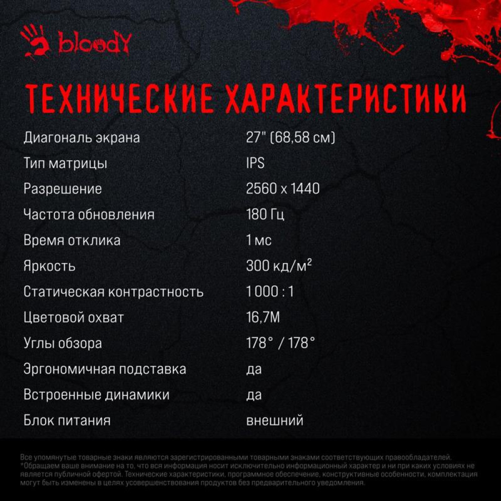 Монитор Bloody 27" MN270Q черный IPS LED 1ms 16:9 HDMI M/M матовая 300cd 178гр/178гр 2560x1440 180Hz G-Sync DP 2K 3.95кг