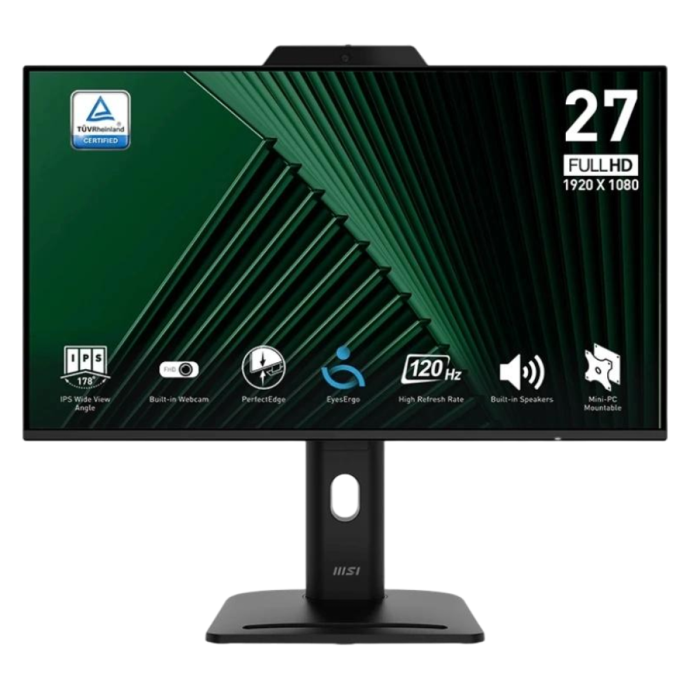 Монитор/ MSI PRO MP272PMG 27" 1920x1080, IPS, 120Hz, Webcam, 4ms, 100M:1, 300cd, VGA, HDMI, DP, 3xUSB, Speaker, H. adj, Pivot, VESA, 1y, Black