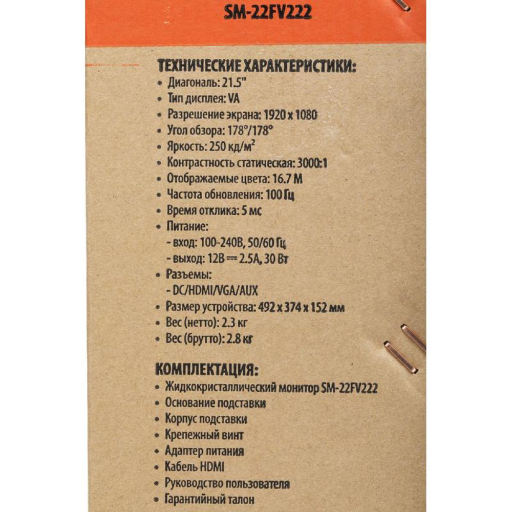 Монитор SunWind 21.5" SM-22FV222 черный VA 5ms 16:9 HDMI матовая 250cd 178гр/178гр 1920x1080 100Hz FreeSync VGA FHD 2.29кг
