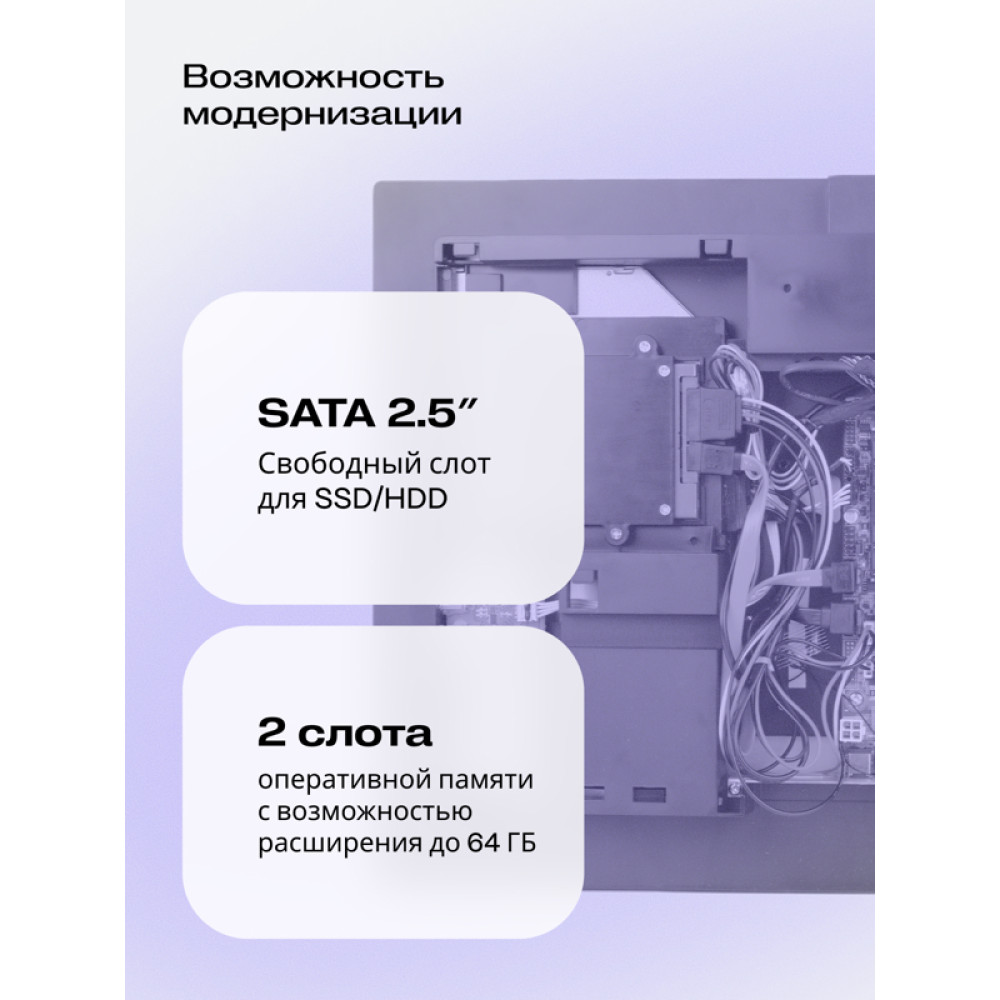Графический чипсет Intel UHD Graphics 730 отвечает за качественную передачу изображения даже в динамичных сценах, исключает возникновение битых пикселей, появление размытости. Экран диагональю 23,8 дюймов с разрешением 1920х1080 пикселей предотвращает искажение оттенков. IPS-матрица обеспечивает высокую детализацию картинки во время воспроизведения видео, игр.