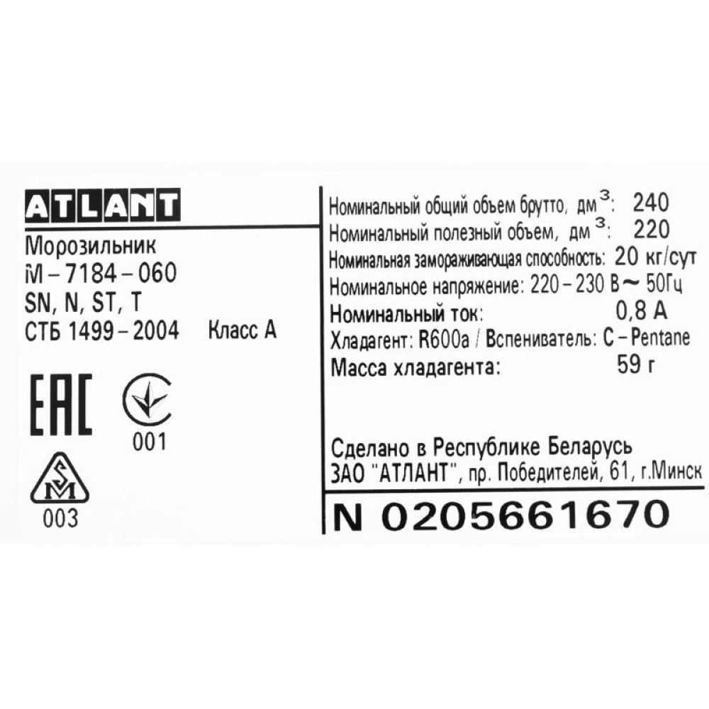 Морозильная камера Атлант M-7184-060 мокрый асфальт