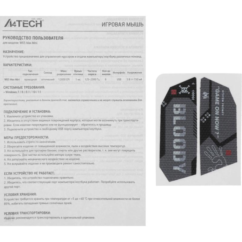 Мышь A4Tech Bloody W65 Max Mini черный оптическая 12000dpi USB 9but (W65 MAX MINI STONE BLACK)