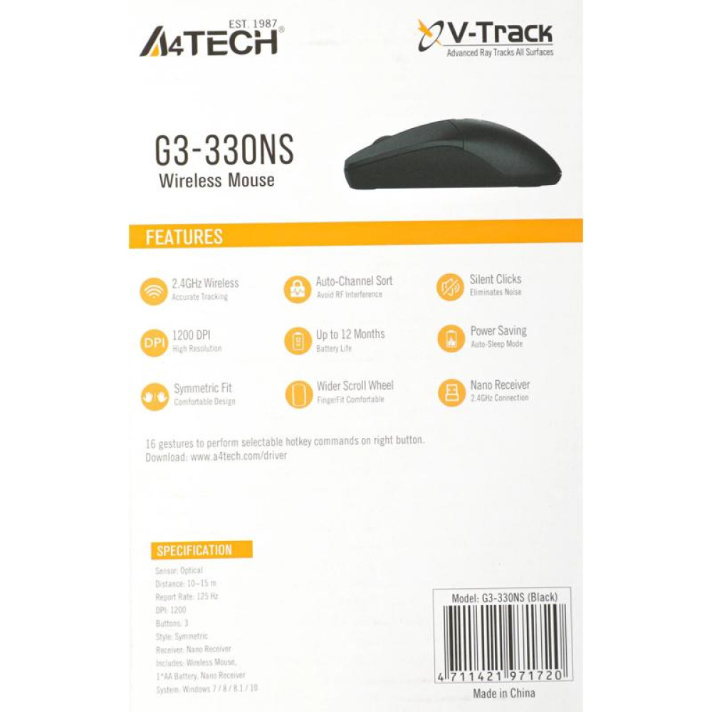 Мышь A4Tech G3-330NS черный оптическая 1200dpi silent беспров. USB 3but