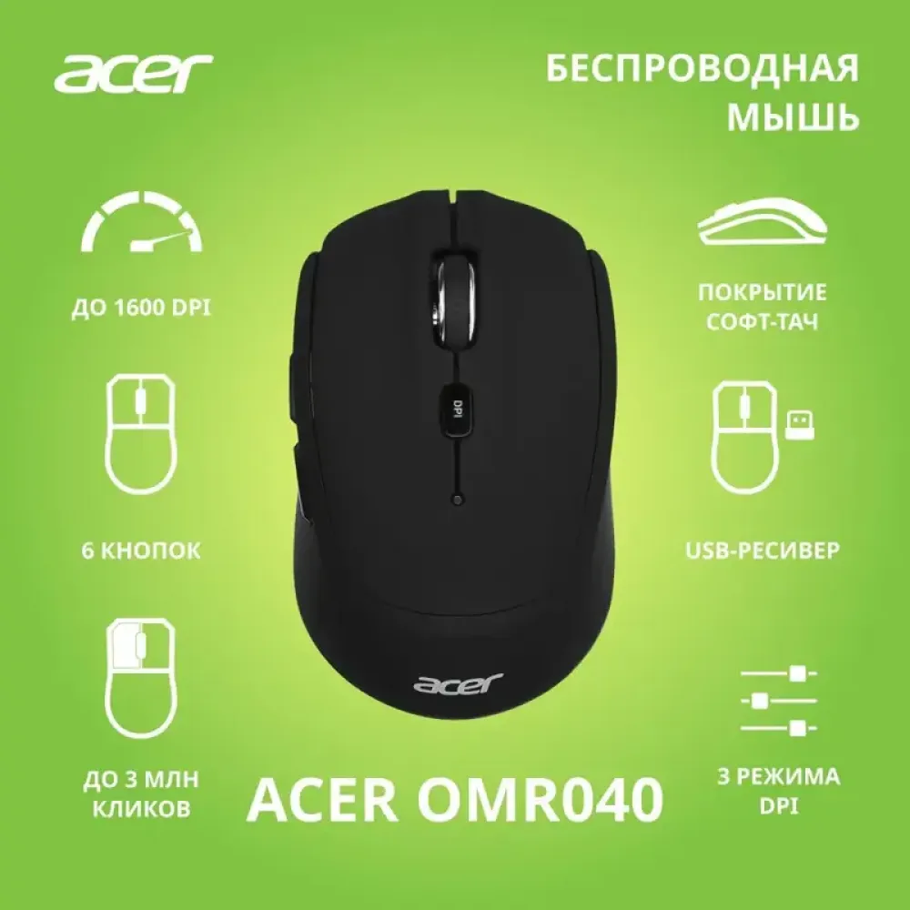 Мышь Acer OMR040 сочетает в себе удобство беспроводного подключения и комфорт при длительной работе. Встроенный чип обеспечивает большую дистанцию и более стабильное соединение. Мышь имеет асимметричную форму, подходит для правшей. Настроить ее очень легко — просто вставьте миниатюрный беспроводной приемник в USB-слот.