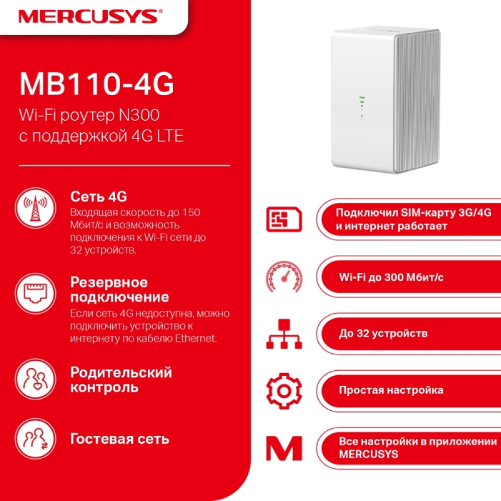 Mercusys MB110-4G благодаря поддержке технологии 4G LTE данная модель обеспечивает входящую скорость до 150 Мбит/с, а исходящую — до 50 Мбит/с. Также поддерживается диапазон Wi‑Fi 2,4 ГГц со скоростью до 300 Мбит/с. Поддержка технологий FDD и TDD гарантирует совместимость устройства с SIM‑картами большинства операторов мобильной связи. Чтобы создать подключение к интернету для Wi‑Fi устройств, достаточно вставить карту nano‑SIM в роутер и включить его.