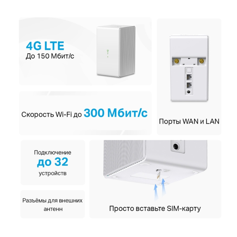 Входящая скорость до 150 Мбит/с и возможность подключения к Wi‑Fi сети до 32 устройств.