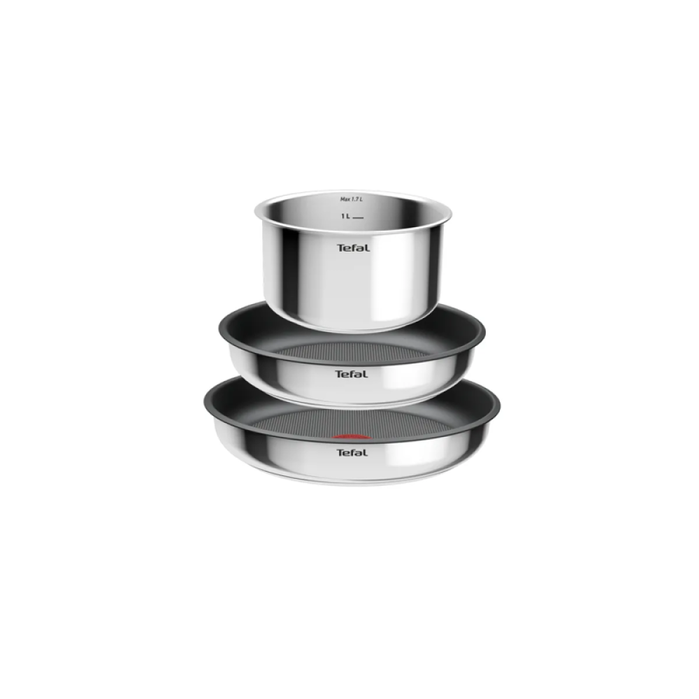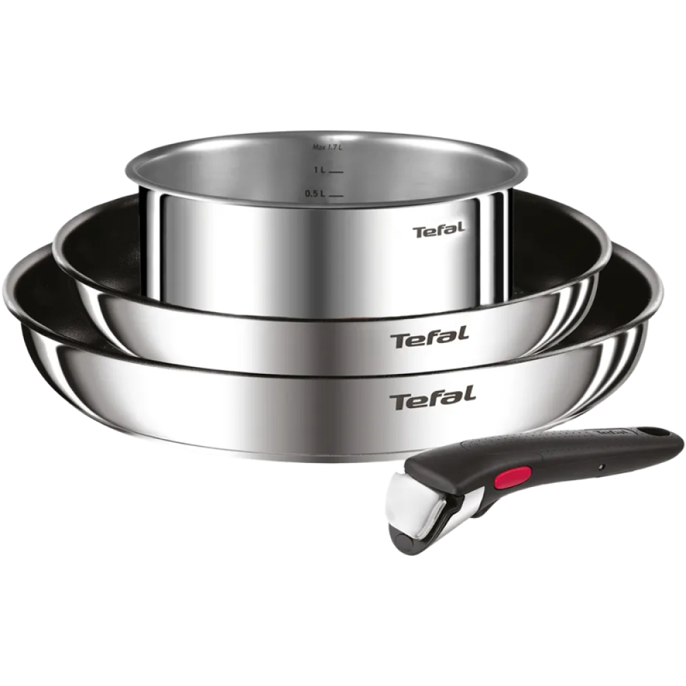 TEFAL L881S404 включает в себя три основных предмета: ковш диаметром 16 см, сковороду 22 см и сковороду 26 см. Все изделия комплектуются одной съемной ручкой, что позволяет экономить пространство при хранении.