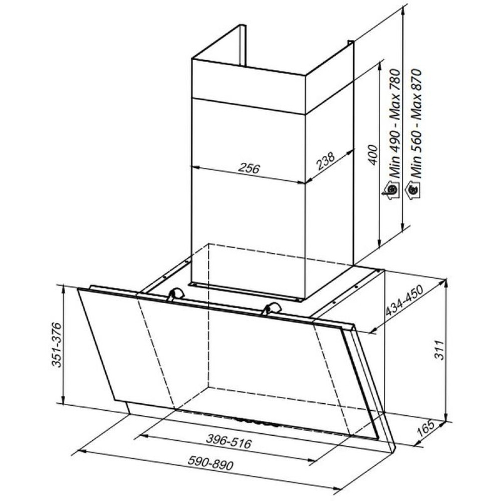 Ширина устройства — 90 см, что оптимально для просторных кухонь и варочных панелей увеличенного размера. Монтируется на стену; диаметр воздуховода — 150 мм. Позволяет эффективно охватывать зону приготовления.