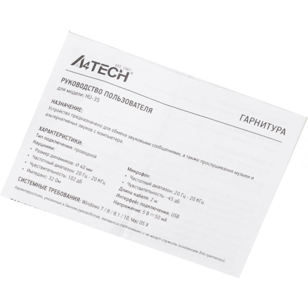 Наушники с микрофоном A4Tech HU-35 черный 2м накладные USB оголовье