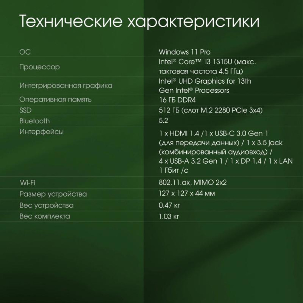 Неттоп Digma Pro Minimax U1 i3 1315U (1.2) 16Gb SSD512Gb UHDG Windows 11 Professional GbitEth WiFi BT 60W темно-серый/черный (DPP3-ADXW02)