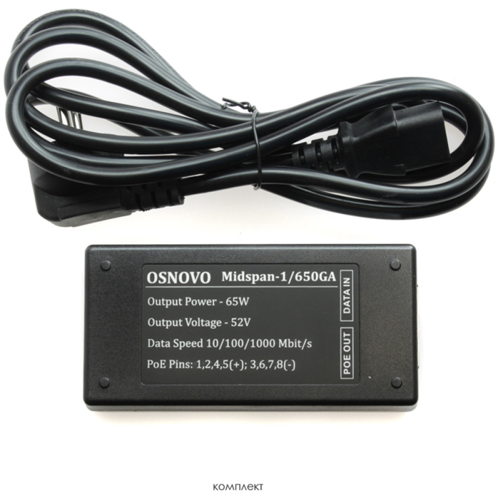 OSNOVO PoE-инжектор Gb Ethernet на 1 порт, мощностью до 65W, напряжение PoE - 52V(конт. 1,2,4,5(+), 3,6,7,8(-))