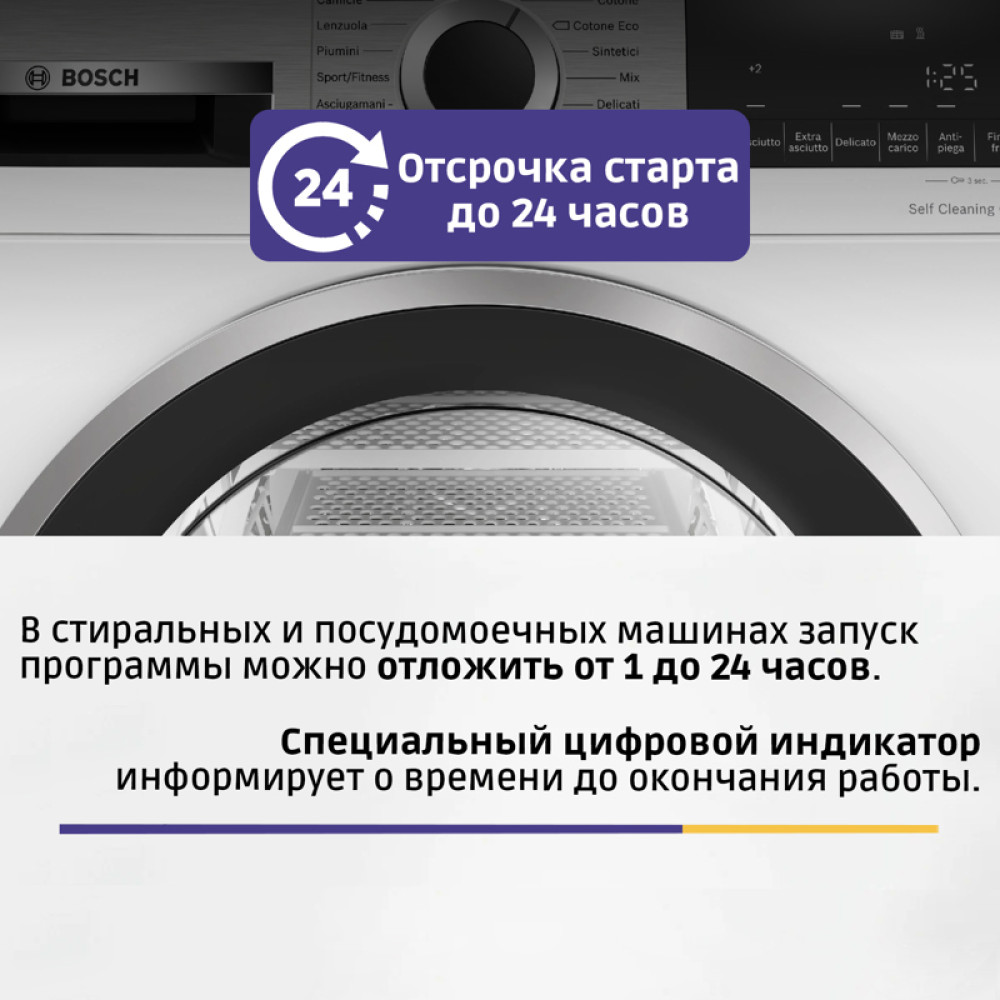 Поворотное управление с сенсорными элементами делает использование машины простым и удобным. Индикация времени до окончания стирки позволяет планировать свои дела, не беспокоясь о состоянии белья. Функция отсрочки старта на 24 часа позволяет запланировать начало стирки на удобное время.