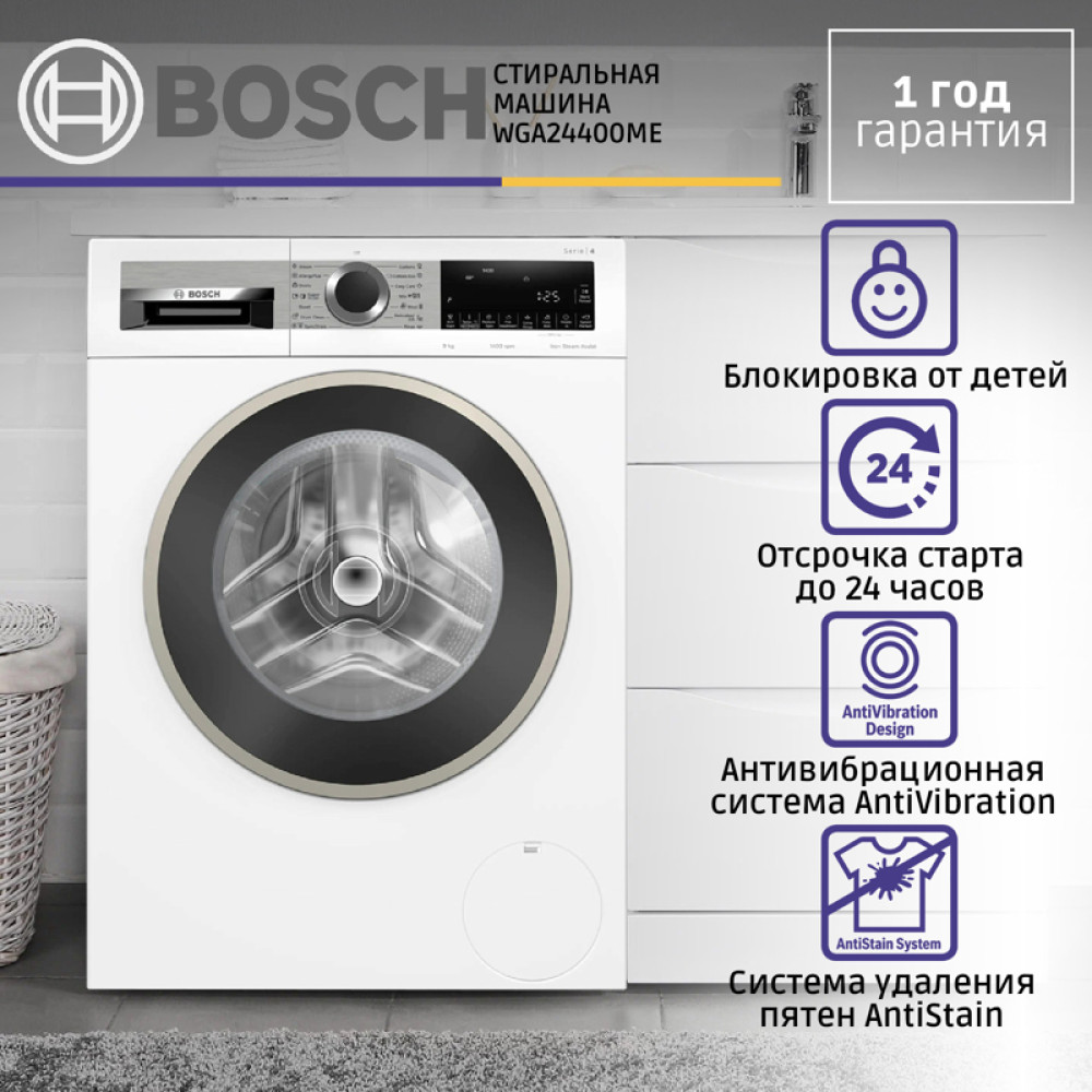 Отдельностоящая стиральная машина BOSCH WGA24400ME 85/60см,1400 об/мин,защита от детей,загрузка 9 кг, дисплей,таймер,класс энергоэффективности А+++,цвет белый
