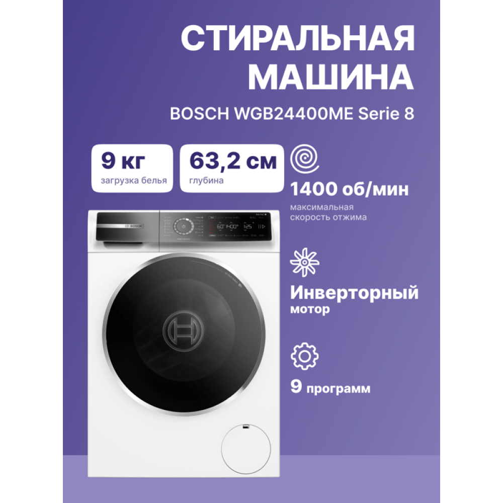 Отдельностоящая стиральная машина BOSCH WGB24400ME 8-Series,полноразмерная стиральная машина,загрузка 9кг, 1400 об/мин.,габариты:845 x 598 x 590 мм., мотор EcoSilence Drive, 4D Wash System,Easy Start Guide,AquaStop®, цвет белый