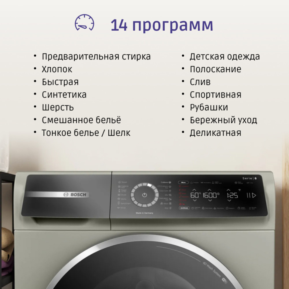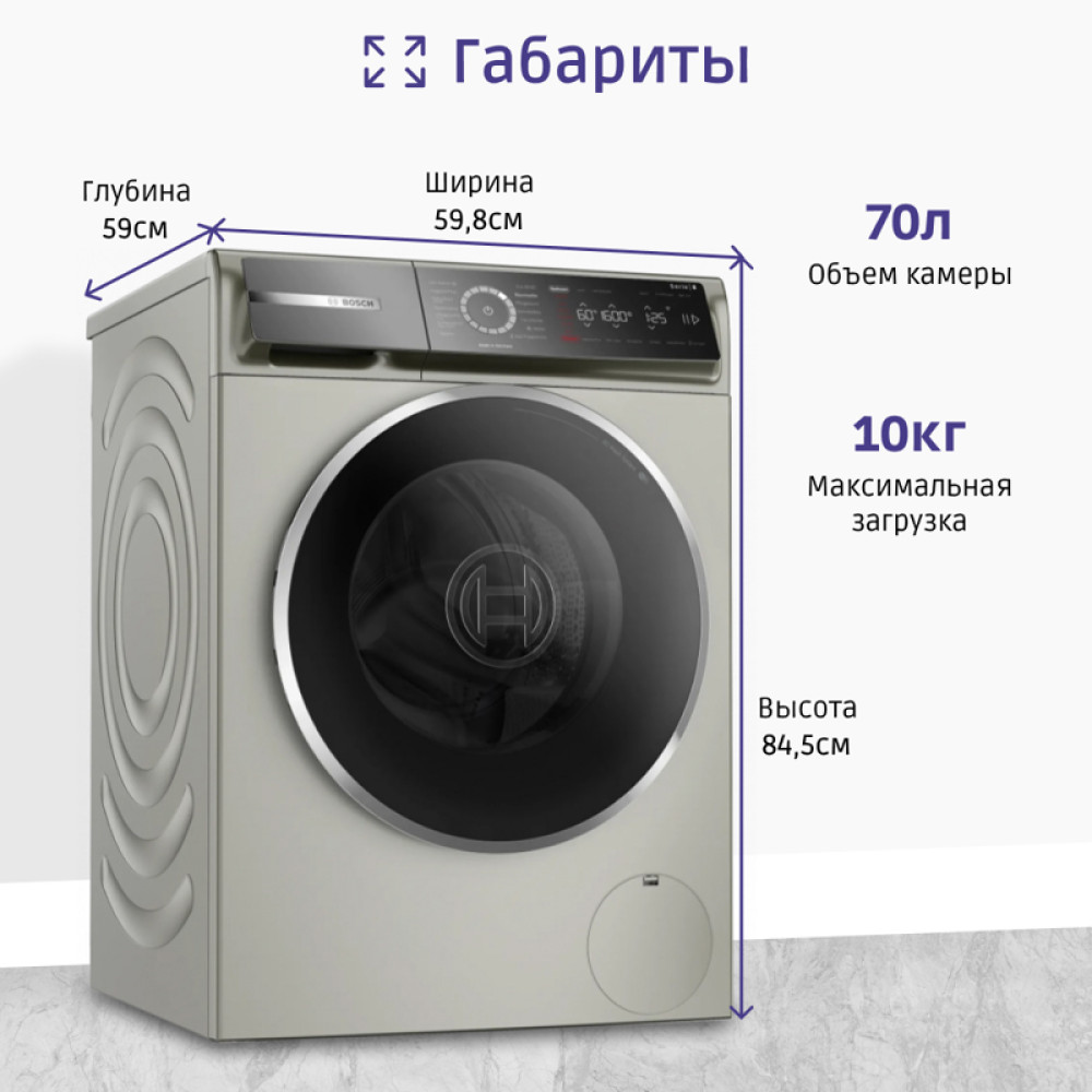 Отдельностоящая стиральная машина BOSCH WGB2560XME 8-Series,полноразмерная стиральная машина,загрузка 10кг, 1600 об/мин.,габариты:845 x 598 x 590 мм., мотор EcoSilence Drive, 4D Wash System,Easy Start Guide,AquaStop®, цвет Silver Inox