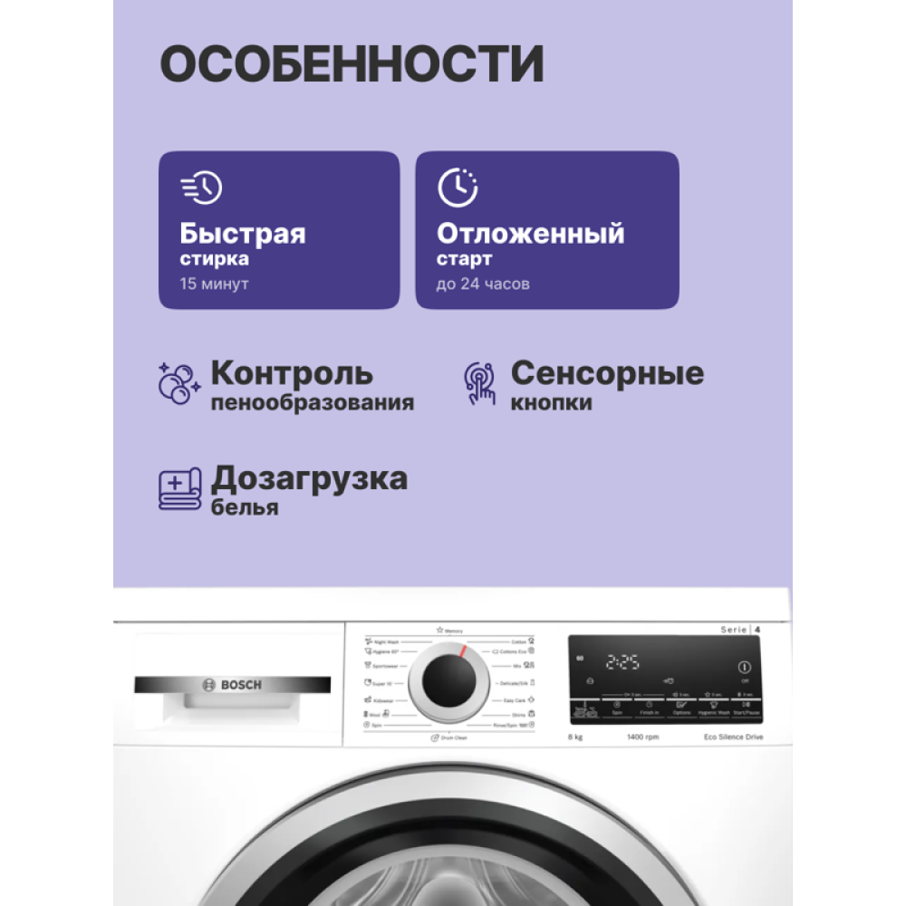Стиральная машина Bosch WLS28460ME - это высококачественная бытовая техника относится к серии Serie 4, представляющей собой отдельностоящую модель с фронтальной загрузкой. Максимальная загрузка при стирке составляет 8 кг, что делает ее идеальной для больших семей, а при сушке - 5 кг. Машина обладает максимальной скоростью отжима 1400 об./мин., что обеспечивает эффективное удаление влаги из одежды.