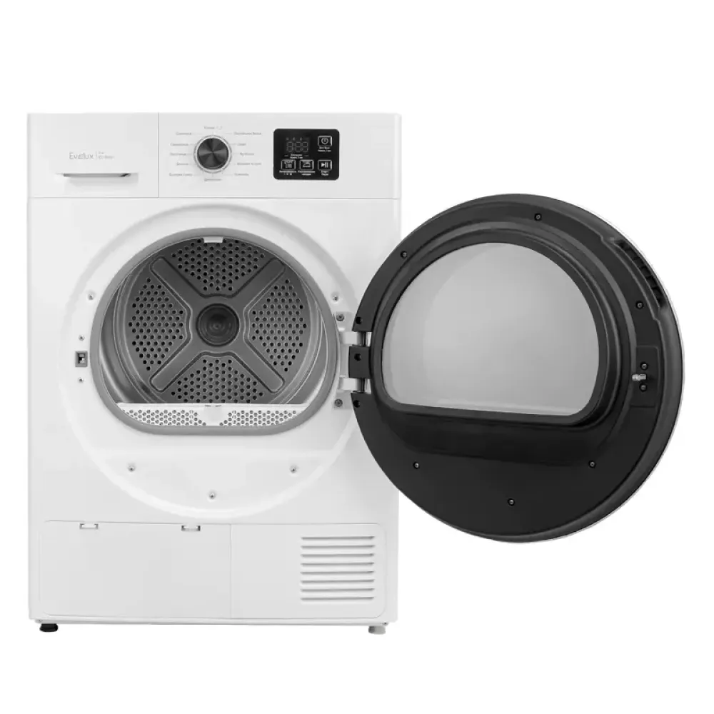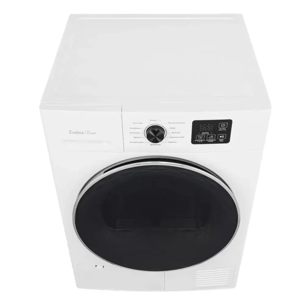 Отдельностоящая сушильная машина EVELUX, электронное управление, дисплей, загрузка 8 кг, 12 программ, "алмазный" дизайн люка, объем барабана 117 л, блокировка панели управления, контроль баланса барабана, энергоэффективность А++, цвет белый