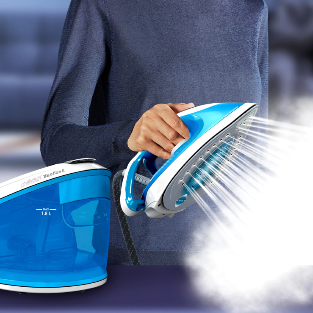 Парогенератор Tefal/ Парогенератор Tefal SV8002E0 Парогенератор Tefal, объем резервуара 1800 мл, автоматическое отключение, вертикальное отпаривание, давление 6 бар, подача пара 120 г/мин, паровой удар 380 г/мин, цвет голубой/белый