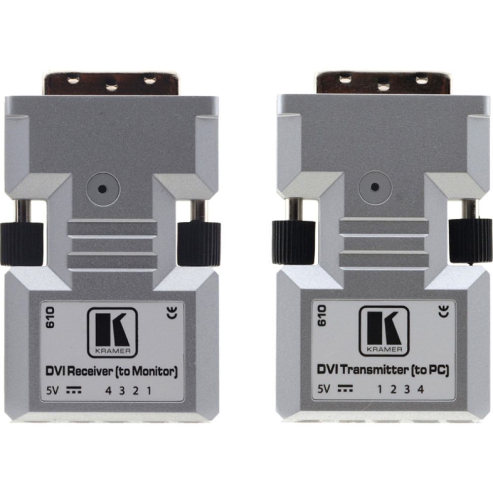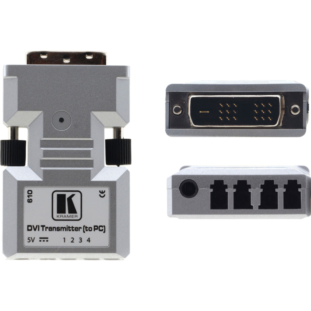 610T и 610R - малогабаритные, подключаемые непосредственно к разъему DVI, передатчик и приемник сигнала DVI по волоконно-оптическому каналу. Приборы продаются комплектом или по отдельности. максимальная скорость передачи данных 4,95 Гбит/с (1,65 Гбит/с на канал); DVI-D Single Link длина линии передачи - до 500 м кабель - многомодовый волоконно-оптический кабель с четырьмя одинарными или двумя сдвоенными разъемами LC питание от внешнего источника постоянного напряжения 5 В; передатчик, кроме того, может питаться от источника сигнала DVI встроенная система считывания и хранения EDID совместимость с HDTV не поддерживает HDCP рекомендуется кабель Kramer C-4LC/4LC.