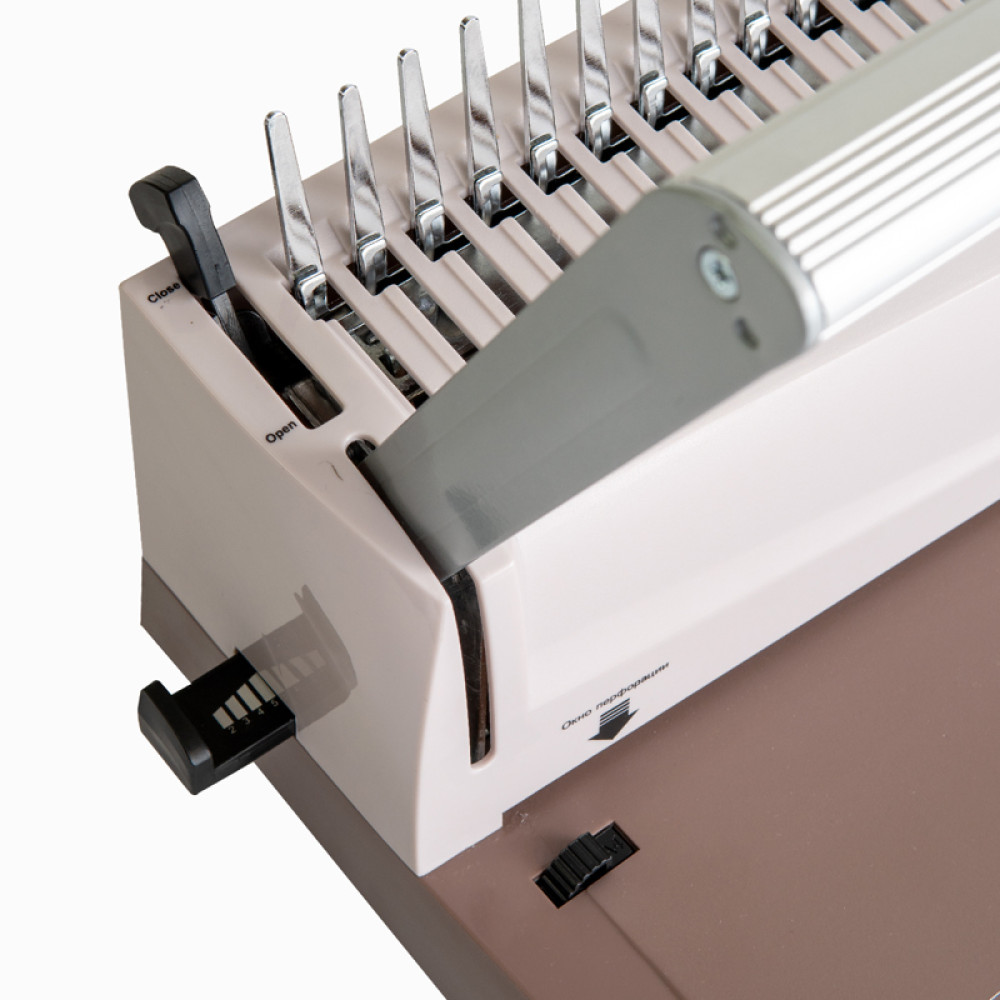 Регулировка глубины перфорации может переплетать как малые (до 100 листов), так и большие объемы бумажных блоков (до 400-500 листов). Также для удобства перфорации листов имеется ограничитель для бумаги формата А4 и А5.