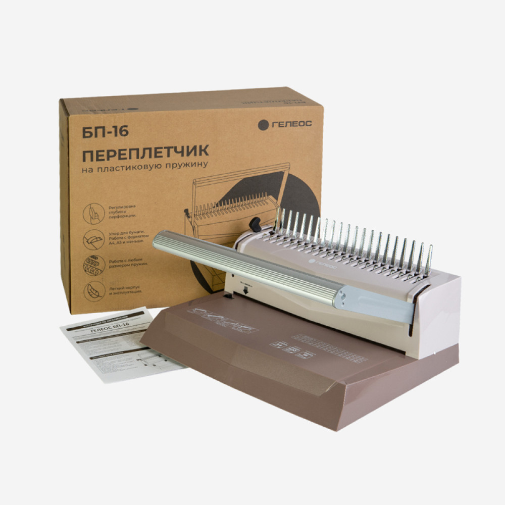 Переплетчик ГЕЛЕОС БП-16 коричневый на пластиковую пружину, А4, ручная перфорация 16 листов, переплет макс до 500 л., глубина перфорации 2-3-4-5 мм