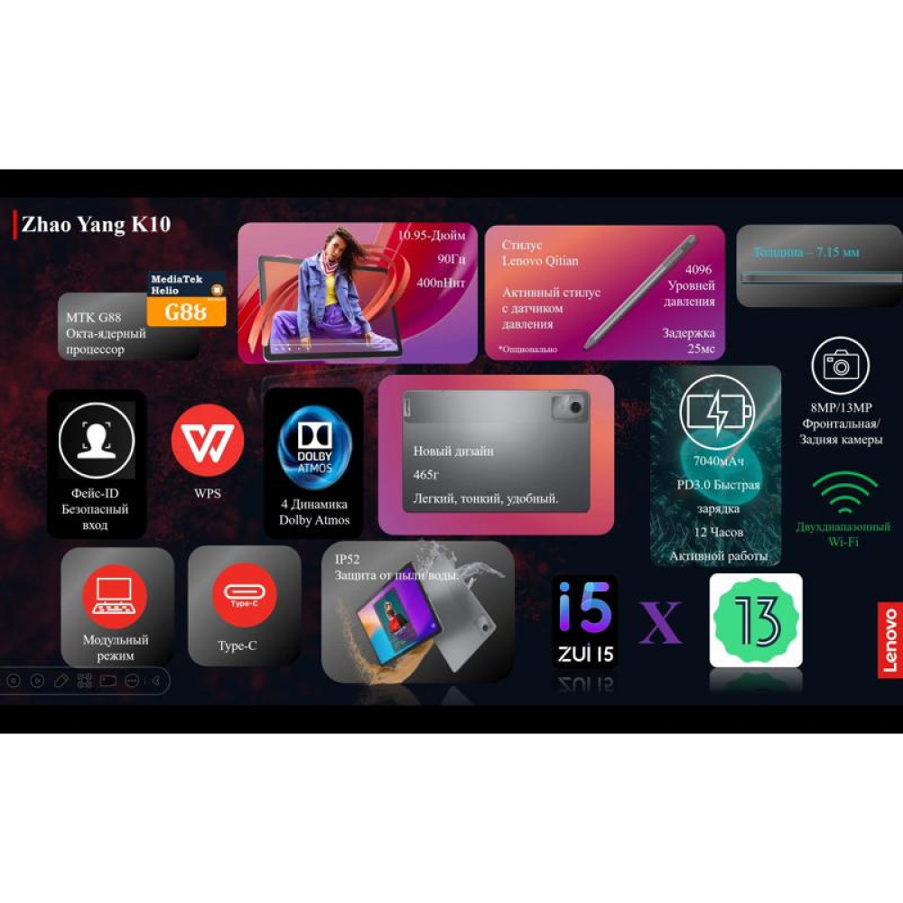 Планшет Lenovo Zhaoyang K10 G88 (3.2) 8C RAM8Gb ROM128Gb 11" IPS 1920x1200 4G 1Sim Android 13 серый 13Mpix 8Mpix BT WiFi microSD 1Tb 7040mAh [TB330XC]